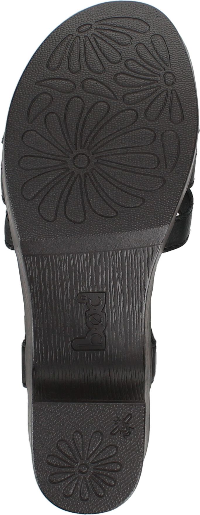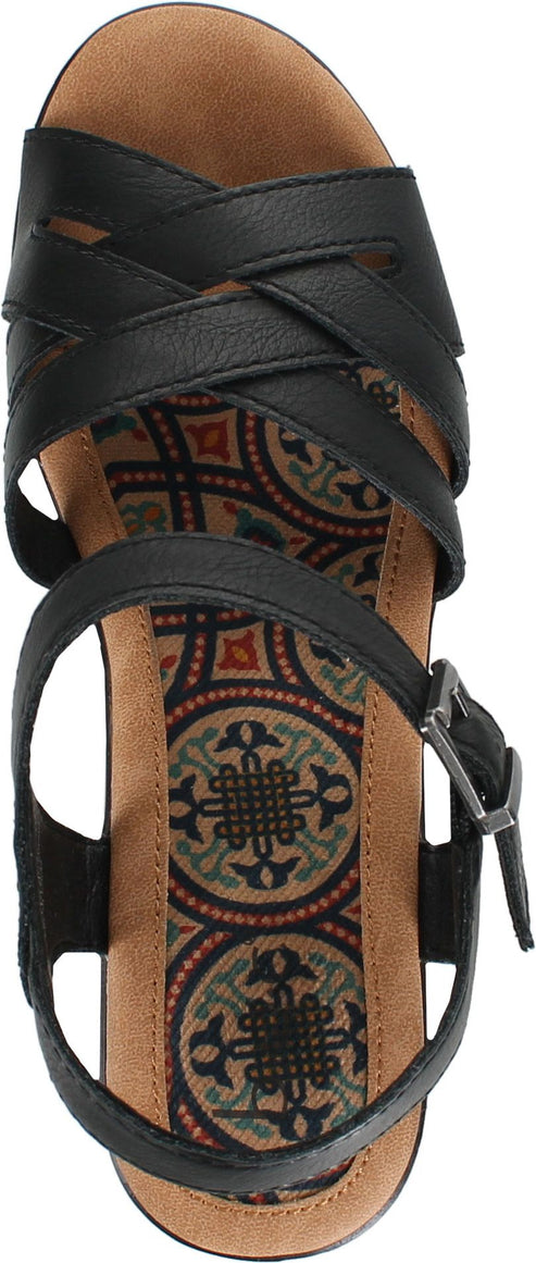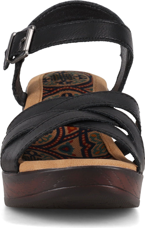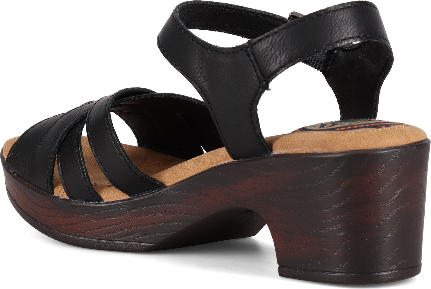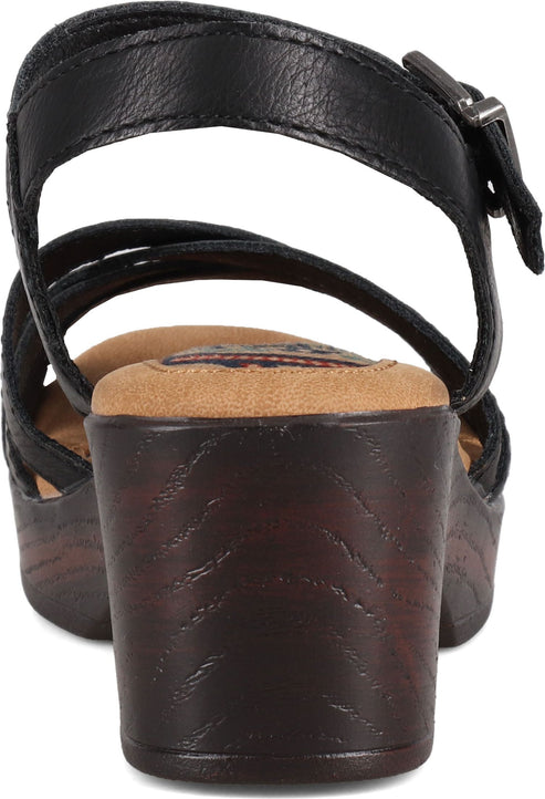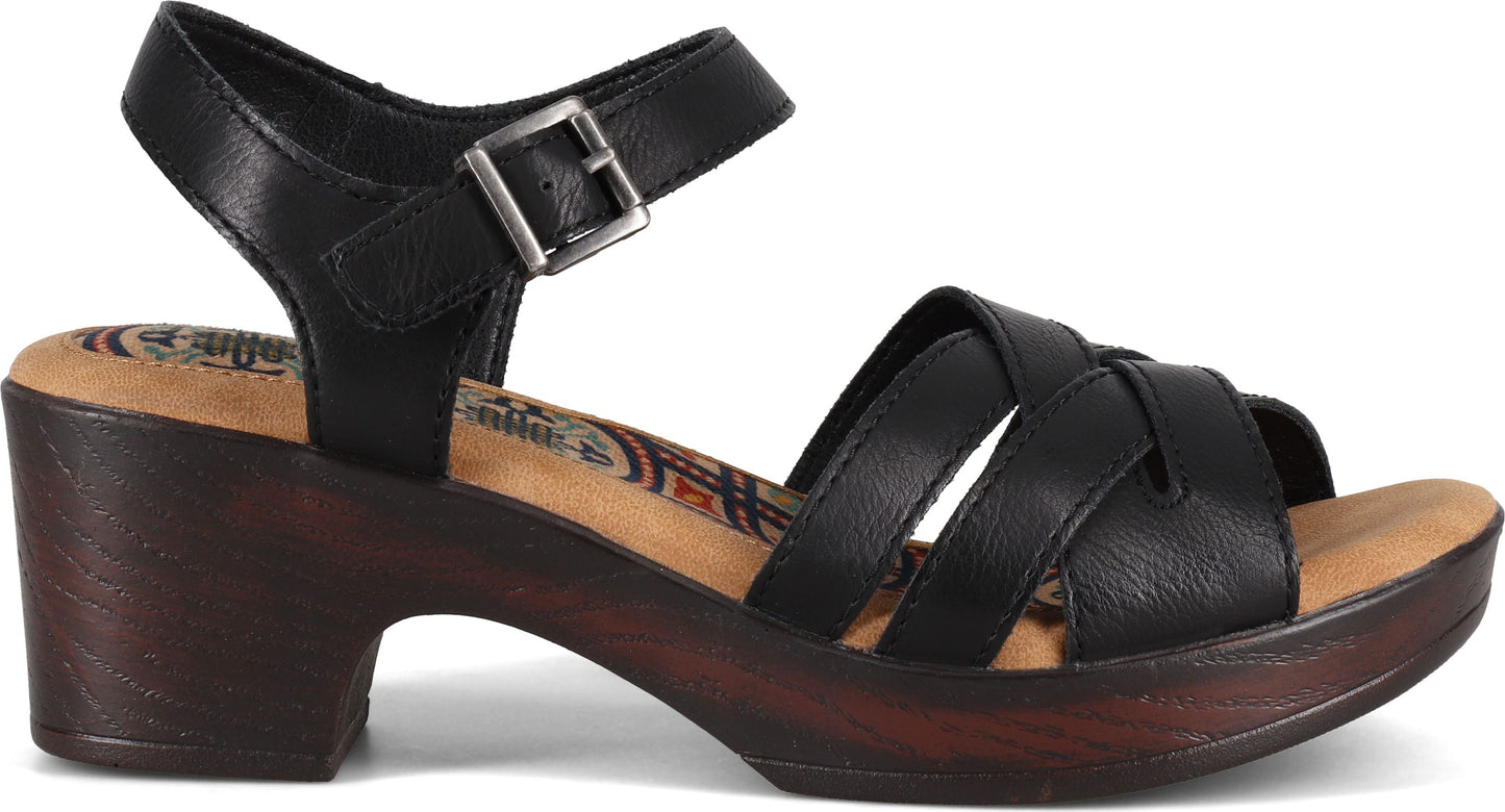 Black sandal with criss-cross straps and ankle strap with buckle on a chunky, wooden block heel.