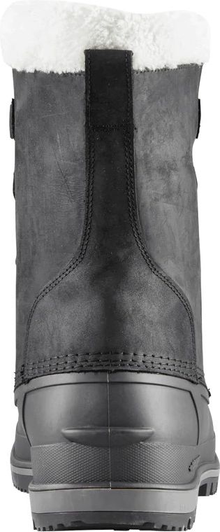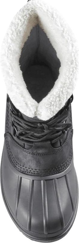 Black winter boot with white fur lining, black laces, and a gray sole.