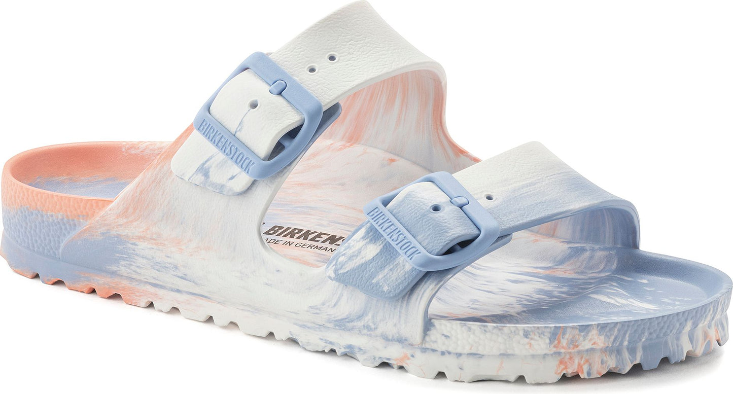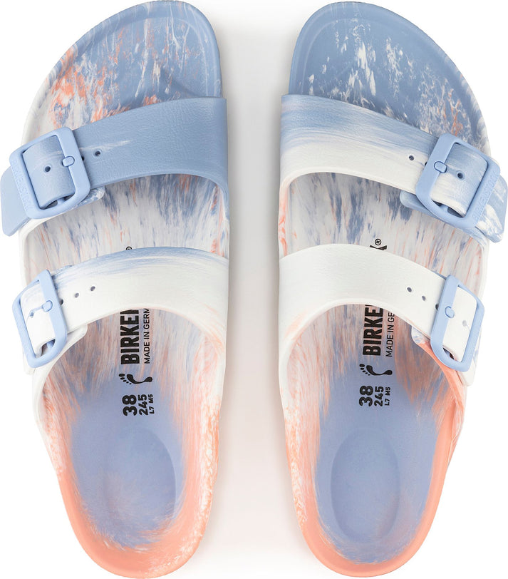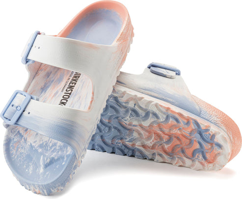 The BIRKENSTOCK Arizona is a genuine classic. Modeled on the cork sandal, this version is made from EVA. The high-quality, odor-neutral EVA has been tested for harmful substances and combines numerous positive attributes. It is ultra lightweight, highly elasticated, waterproof, skin-friendly – and offers the comfort you have come to expect from BIRKENSTOCK. The swirl of colors really catches the eye. Thanks to the creative production process during which EVA particles are heated and then melt, no two pairs are the same. The product and the distribution of colors can thus differ from the photo.