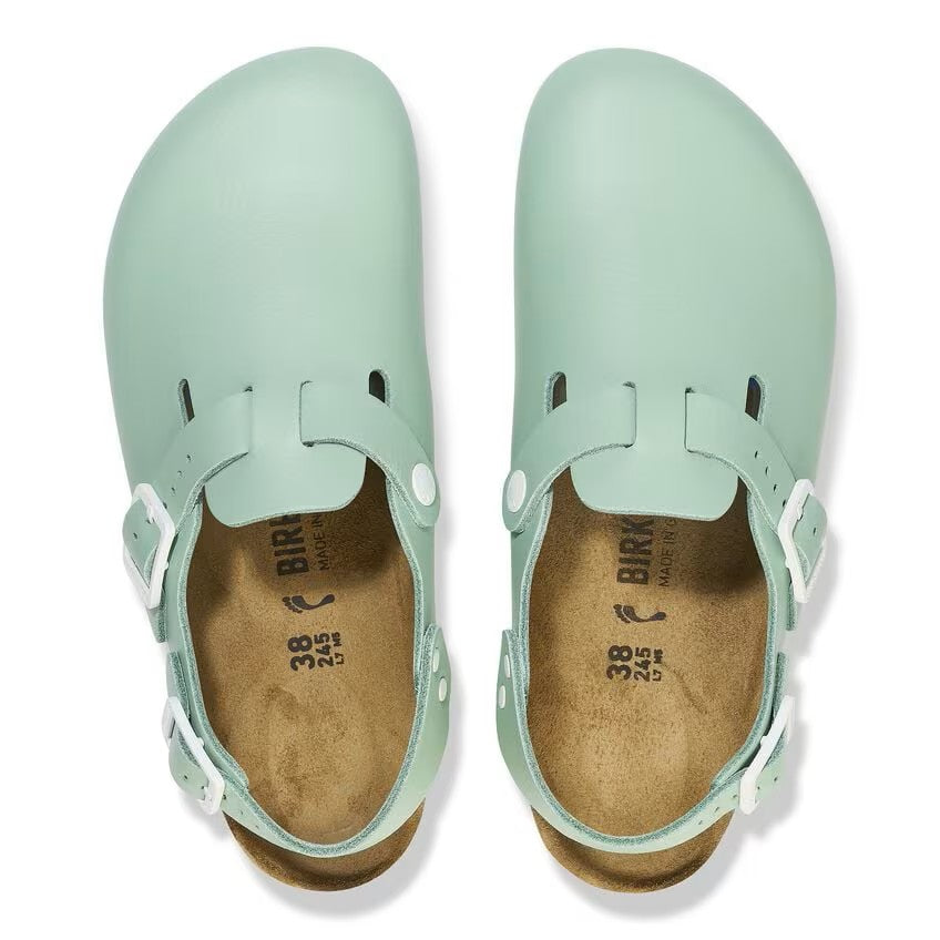The BIRKENSTOCK classic Tokio Pro has become a true classic among professional shoes, especially for medical professions. The clog is fitted with an anatomically shaped original BIRKENSTOCK cork-latex footbed and a dual-component sole. This comprises a cushioning midsole made from EVA and a nonslip, dynamic, treaded outsole made from genuine rubber. The outsole can furthermore be repaired. Therefore, the clog is particularly well suited to day-to-day wear in hospitals. The upper is made from high-quality, particularly soft natural leather which is coated with polyurethane (PU). The PU coating makes the material more durable and thus particularly long-lasting. The clog offers comfort and safety. The shoe’s enclosed design protects the foot from impacts and the injuries they cause. Thanks to the adjustable strap with a sturdy metal buckle on the instep, it can also be adjusted to the wearer’s feet. A backstrap that can be perfectly fitted to the wearer’s feet thanks to an individually adjustable metal buckle provides the foot with additional grip and a firm step – even when everyday working life gets hectic.