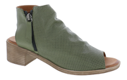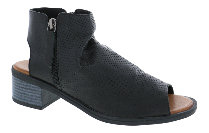 Black peep-toe heeled bootie with a side zipper and a cut-out heel.