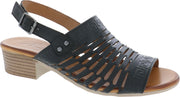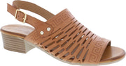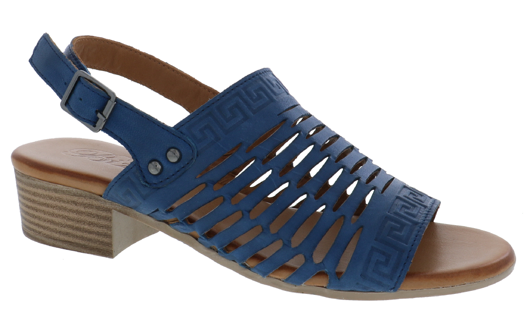 Blue leather sandal with decorative Greek-key pattern, block heel, and adjustable slingback strap.