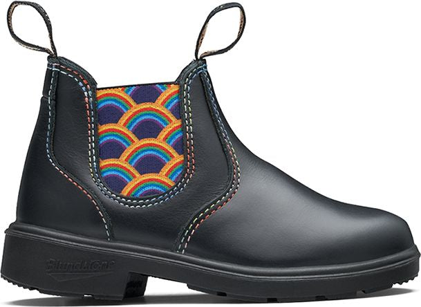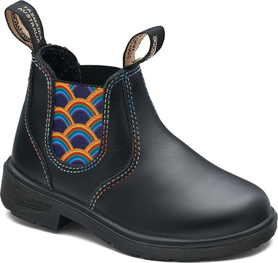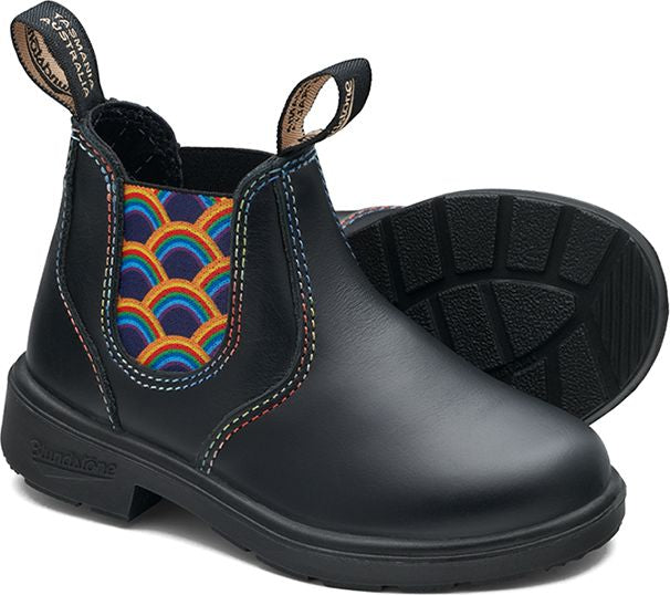 BLUNDSTONE Kids’ series 2254 in Black with Rainbow Elastic and Contrast Stitching. Somewhere over a rainbow stands a happy kid in new boots BY BLUNDSTONE. Every colour in the rainbow, but no laces to rain on a kid’s parade. Or a parent’s! All-day dry comfort. Removable footbeds for months more wear. Perfect hand-me-downs.