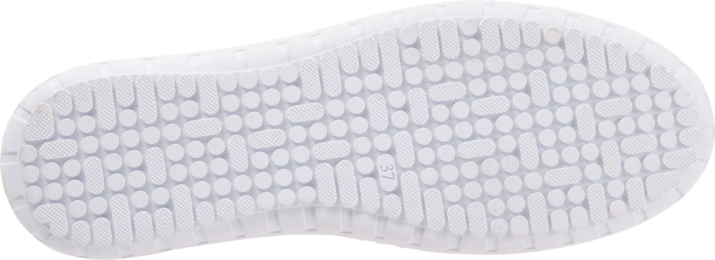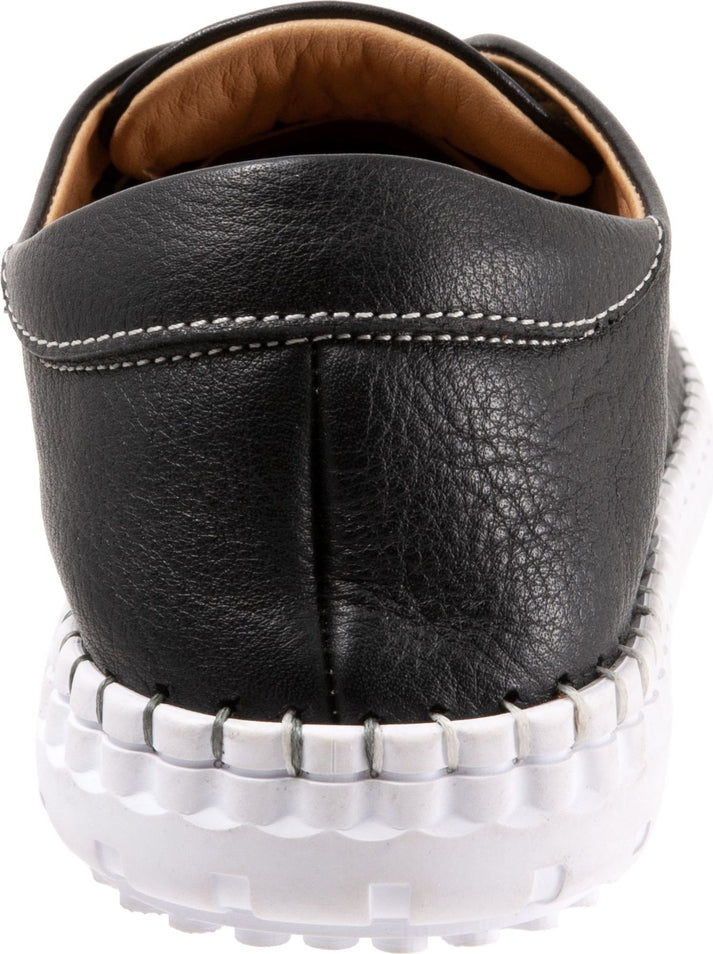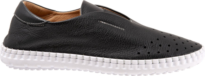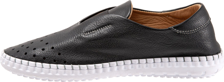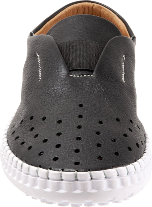 Black leather slip-on shoe with a thick white sole, featuring small ventilation holes near the toe.
