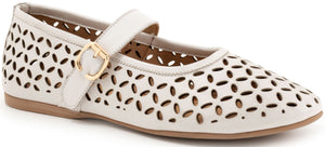 White leather Mary Jane shoe with cutout design and gold buckle closure.