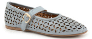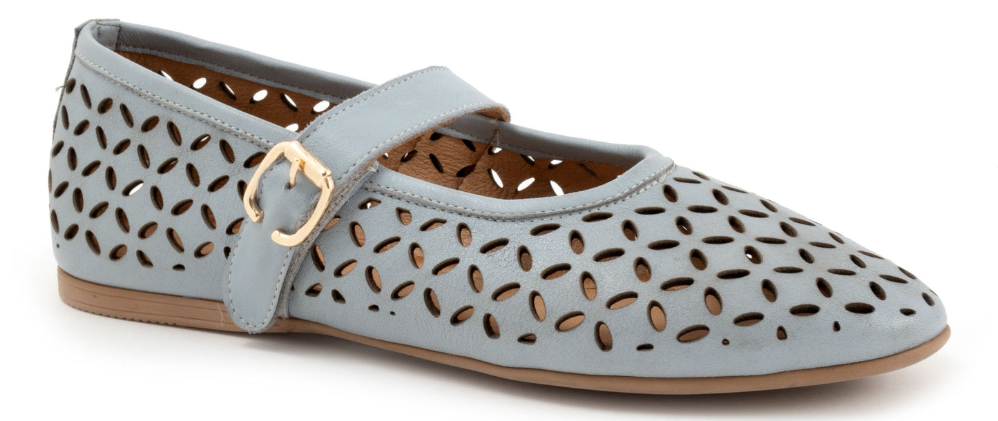 A light blue Mary Jane flat shoe with cutouts and a buckle strap.
