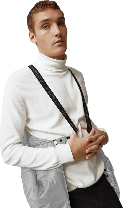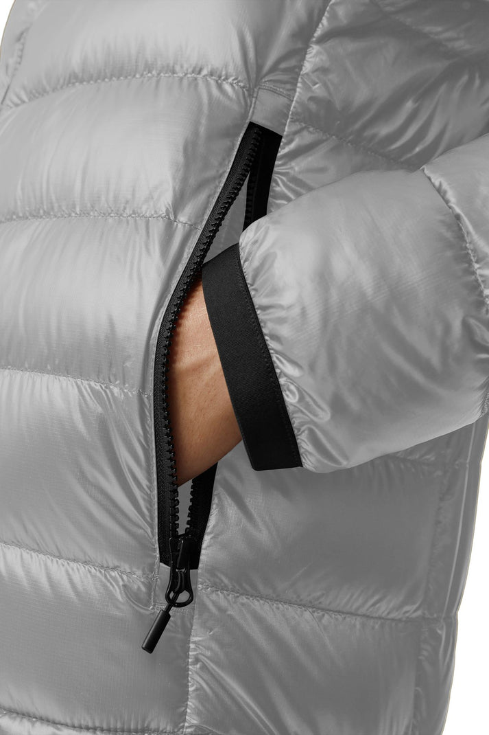 A man in a grey puffer jacket with a black zipper and black pants.