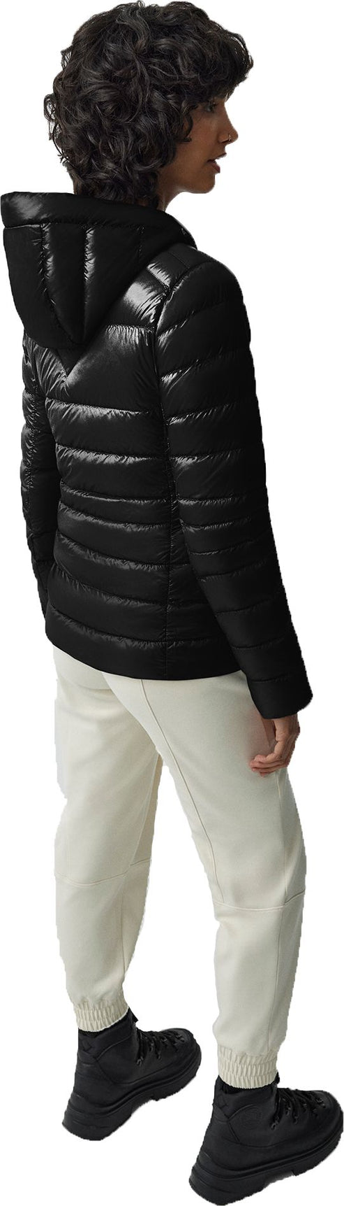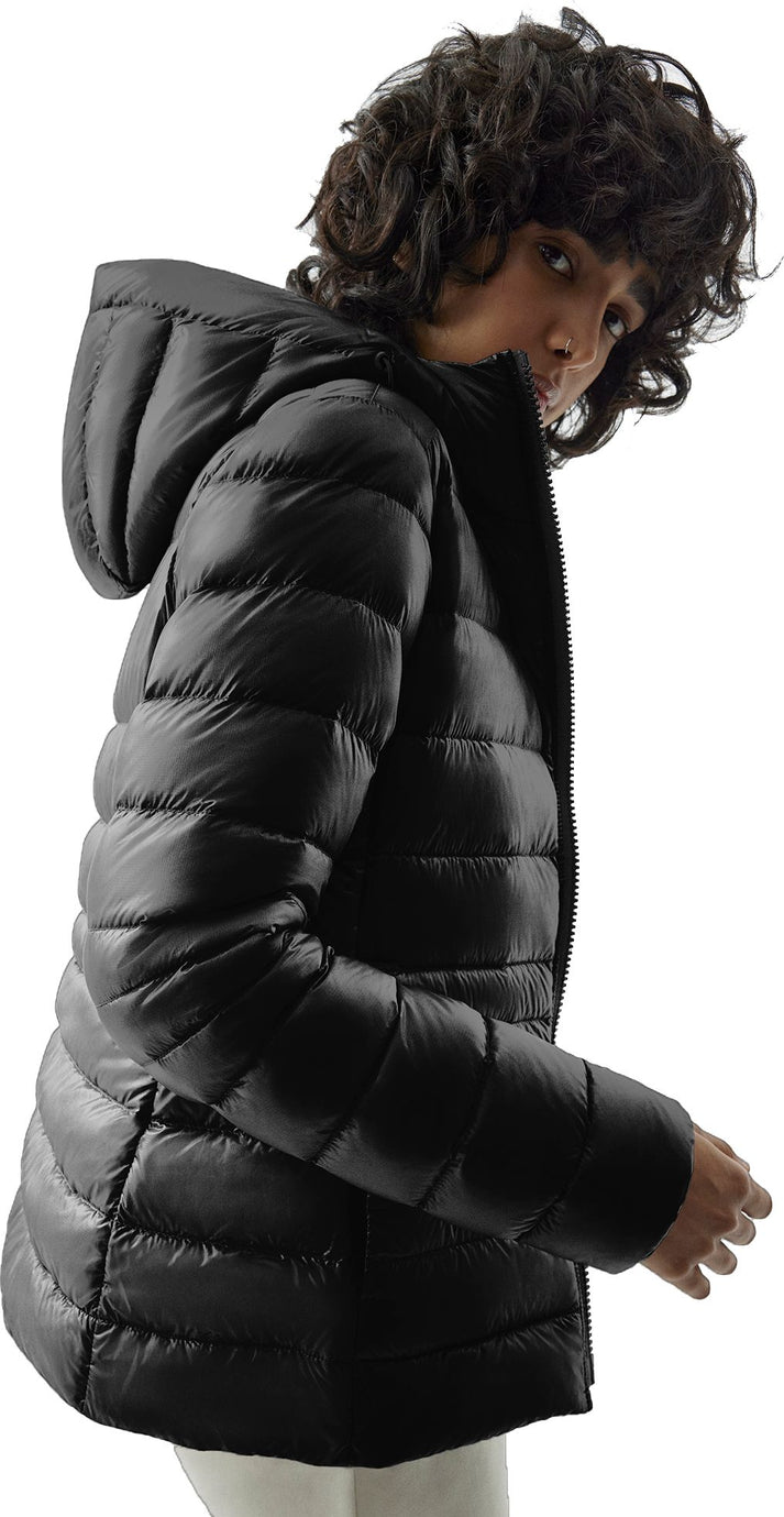 Black padded down jacket with a hood and a zipper front.