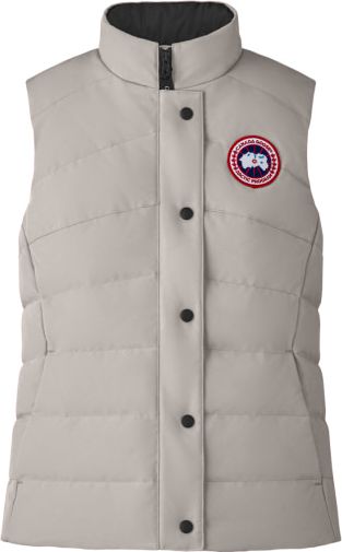 Sleeveless puffy vest in light gray, with black snap buttons and circular logo on the upper right.