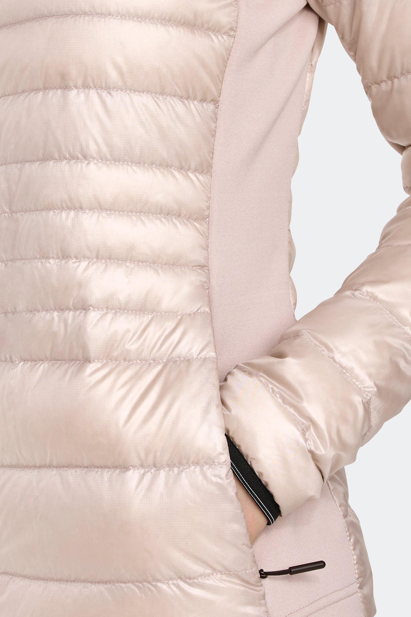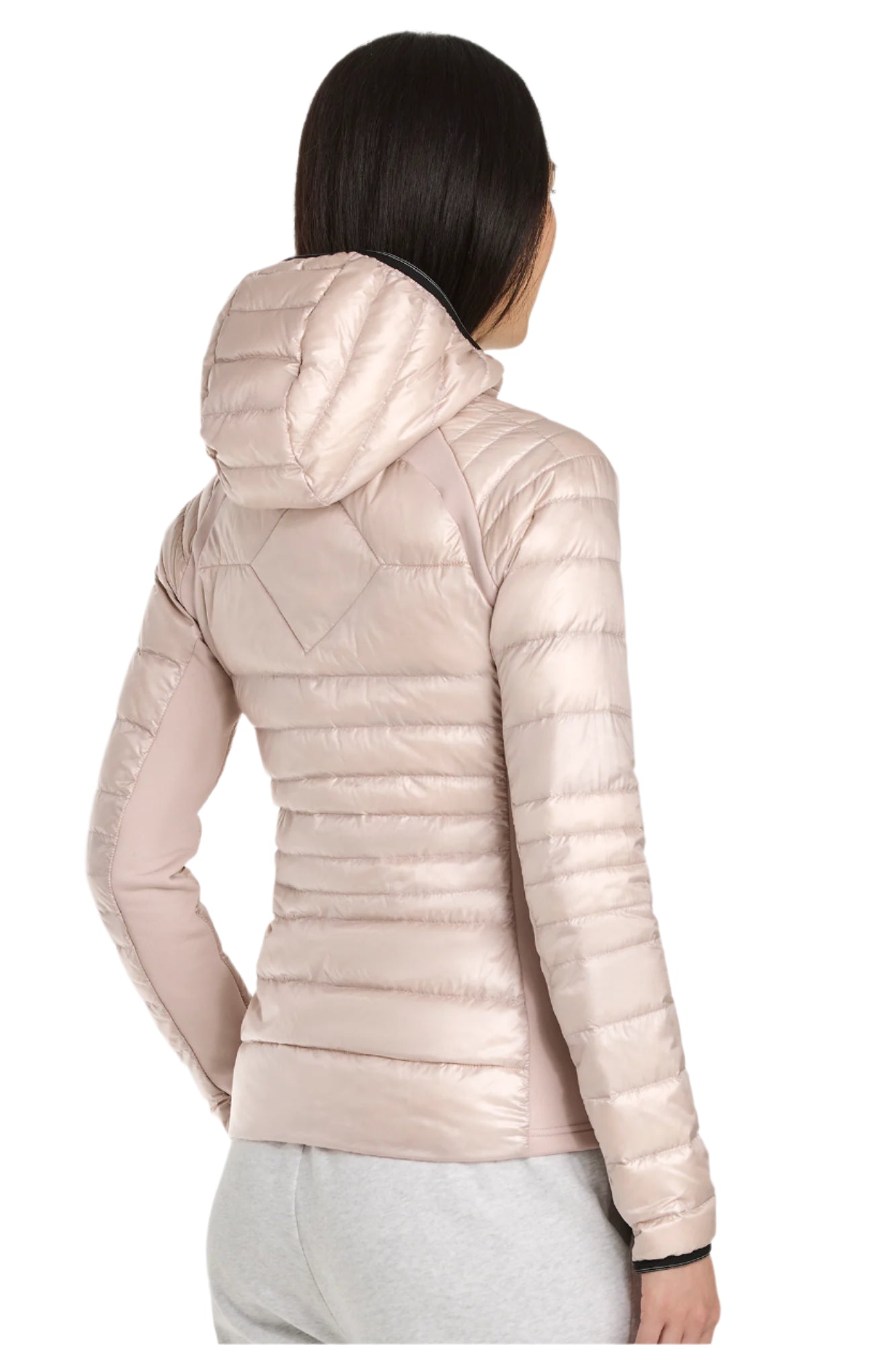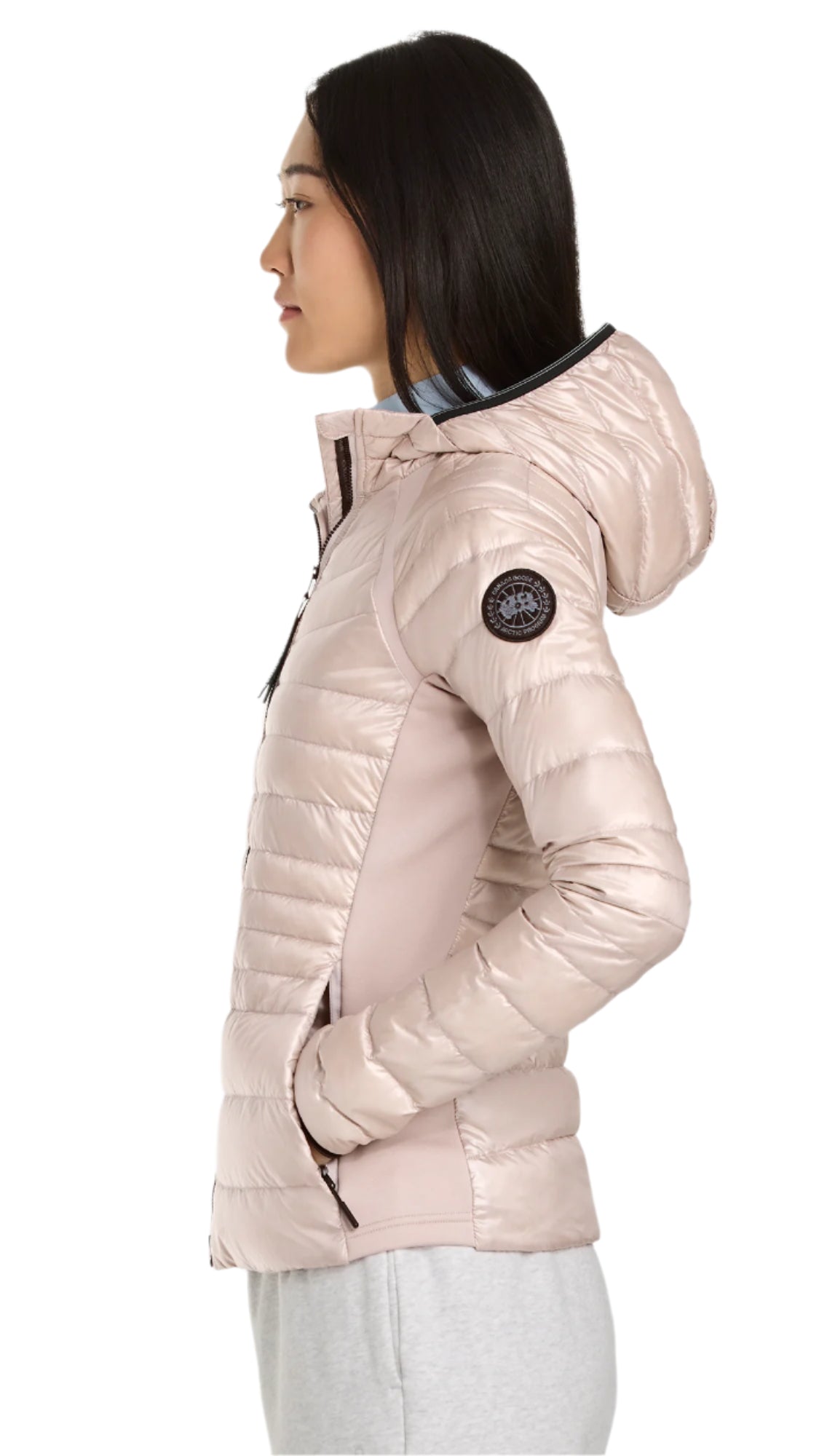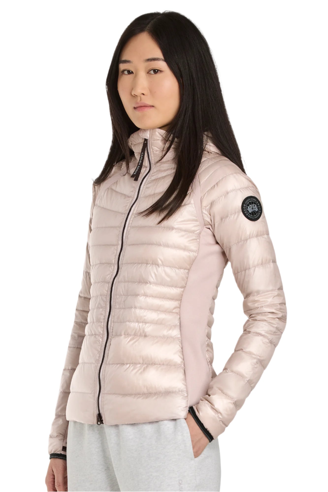 A woman with black hair poses wearing a light pink down jacket with a black zipper.