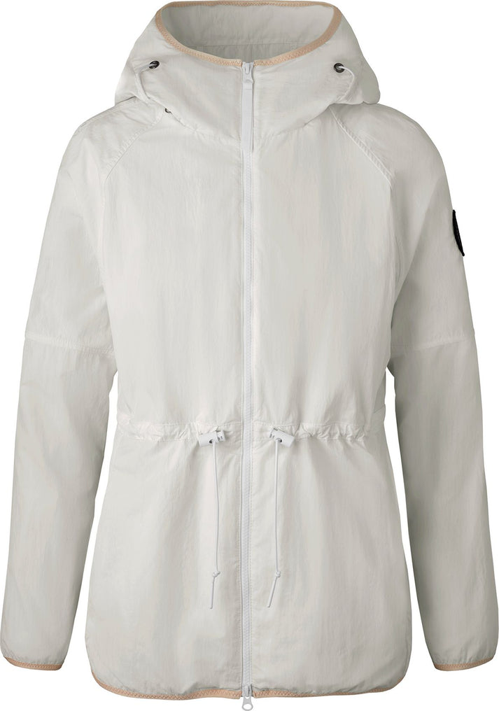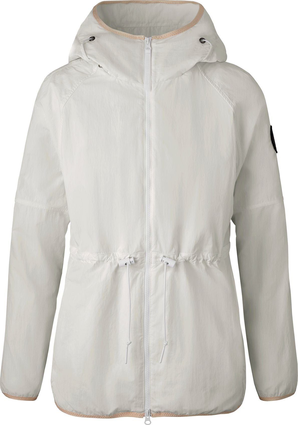 White hooded jacket with drawstring waist.