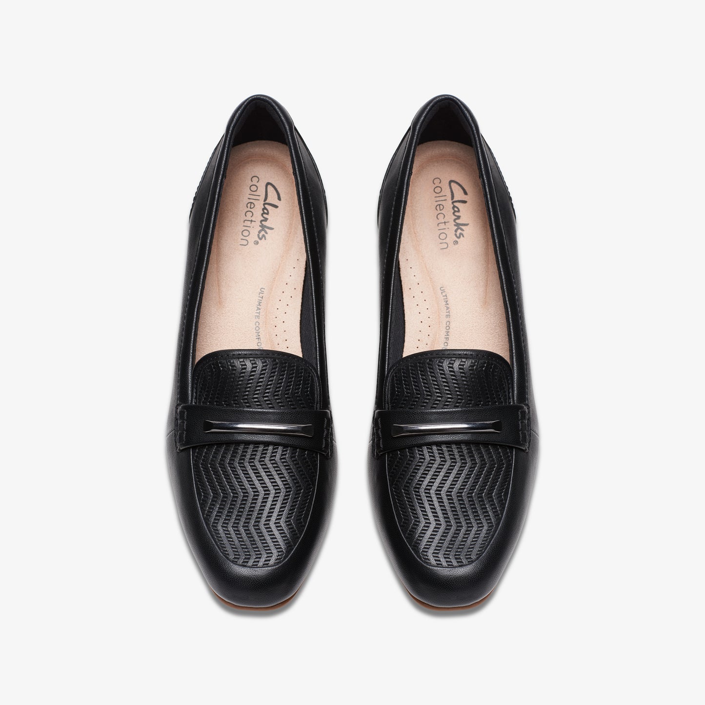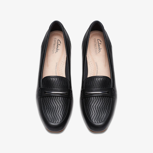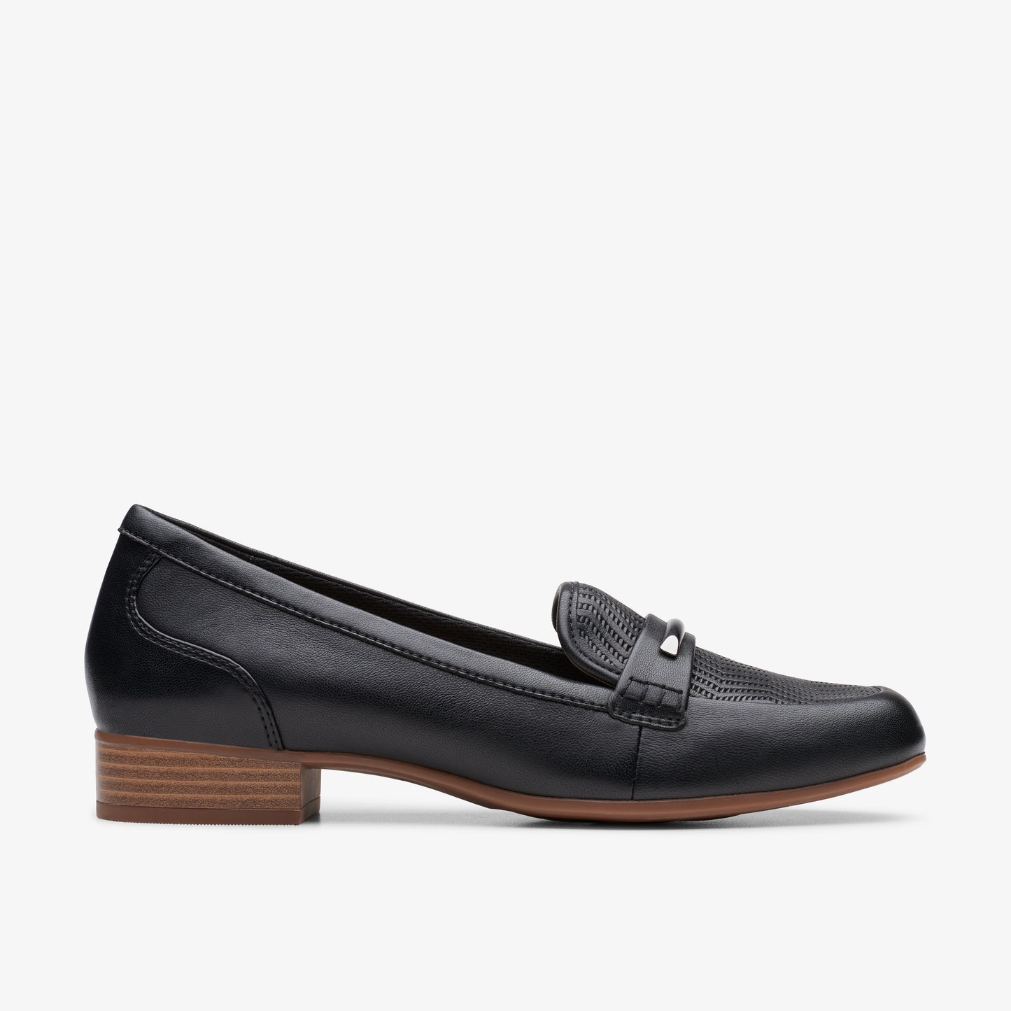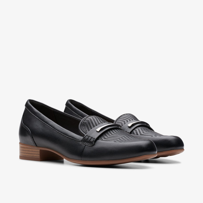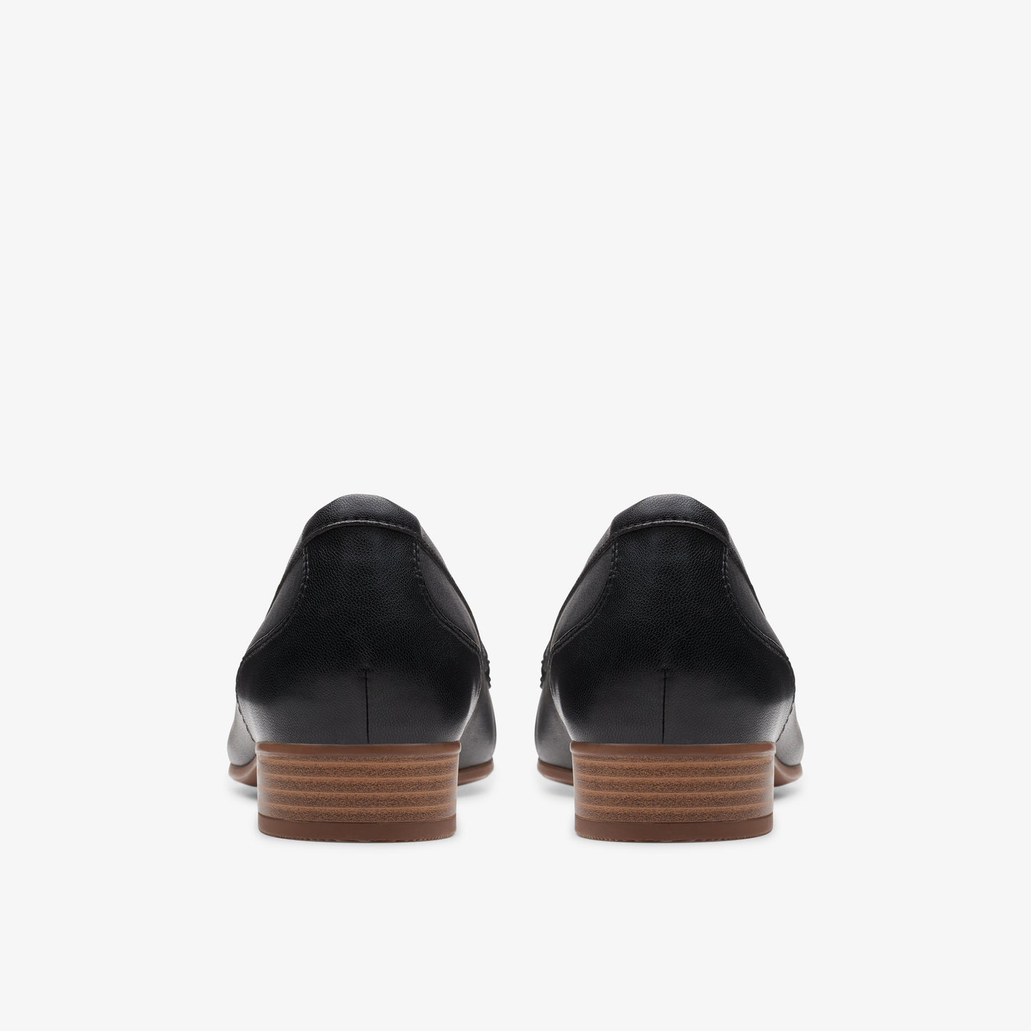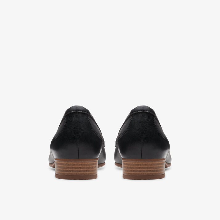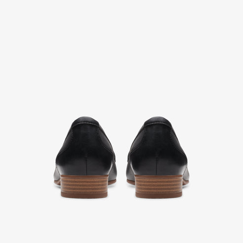 A pair of black leather loafers with a small heel and silver buckle embellishment.