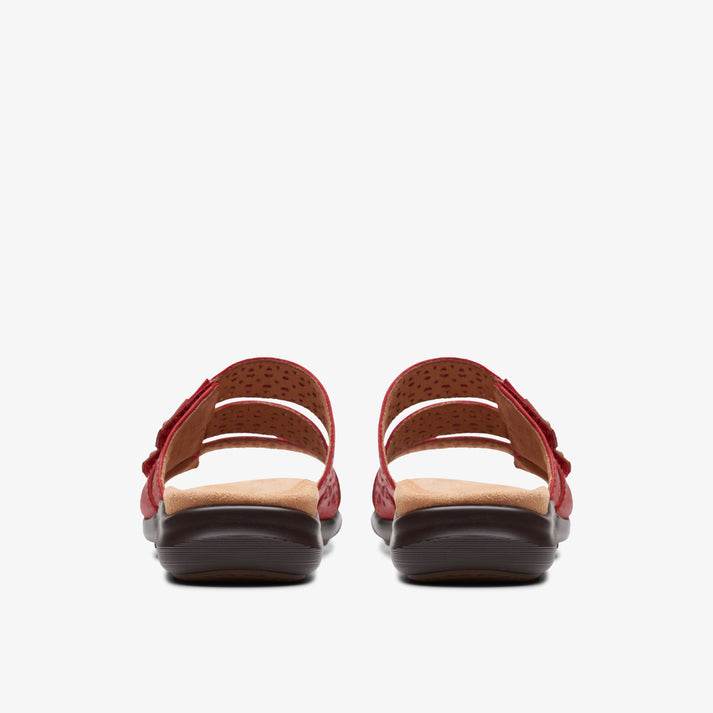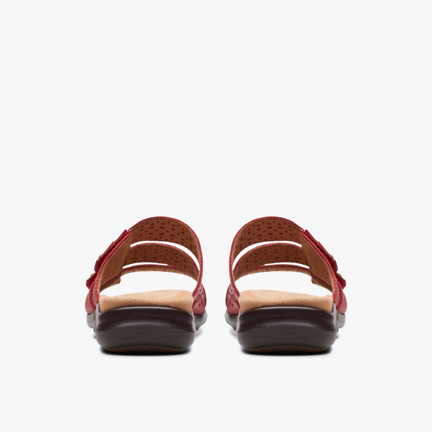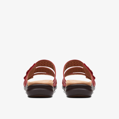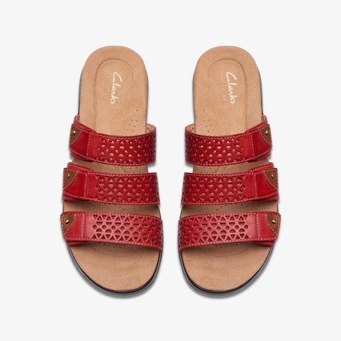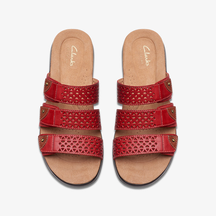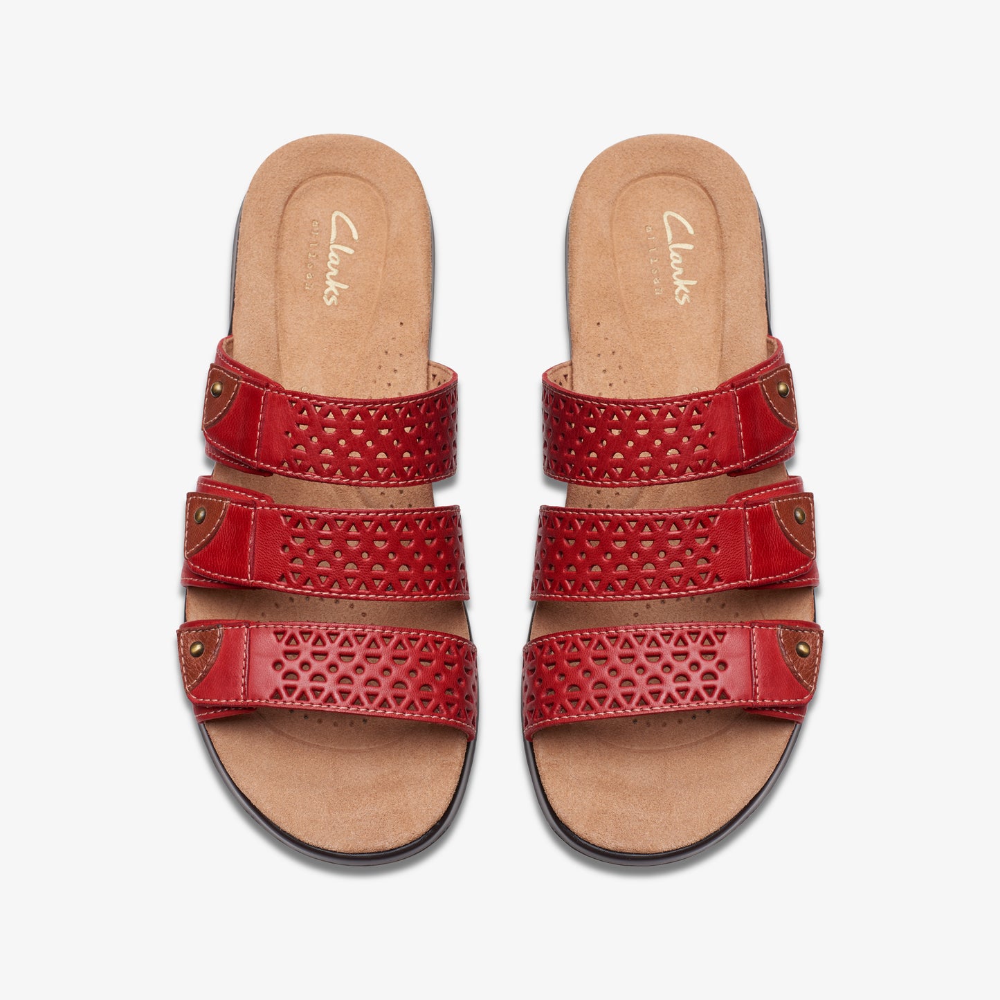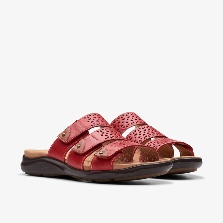 Pair of red leather sandals with perforated straps and adjustable velcro closures.