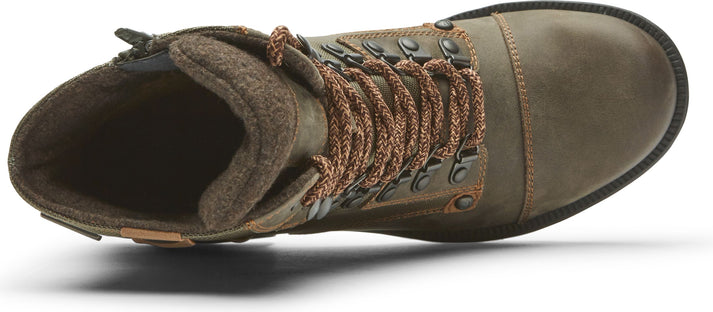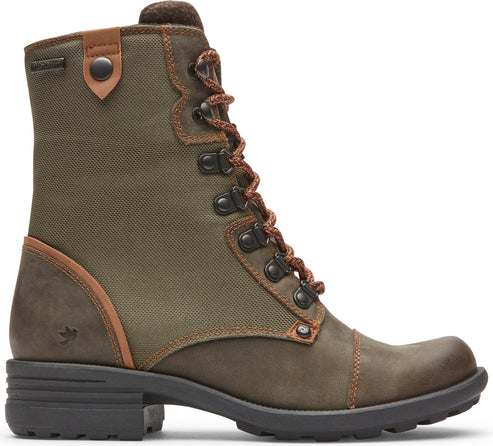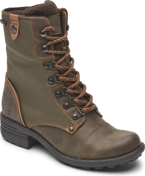 Olive green combat boot with brown laces and accents, featuring a leather and canvas upper and lug sole.