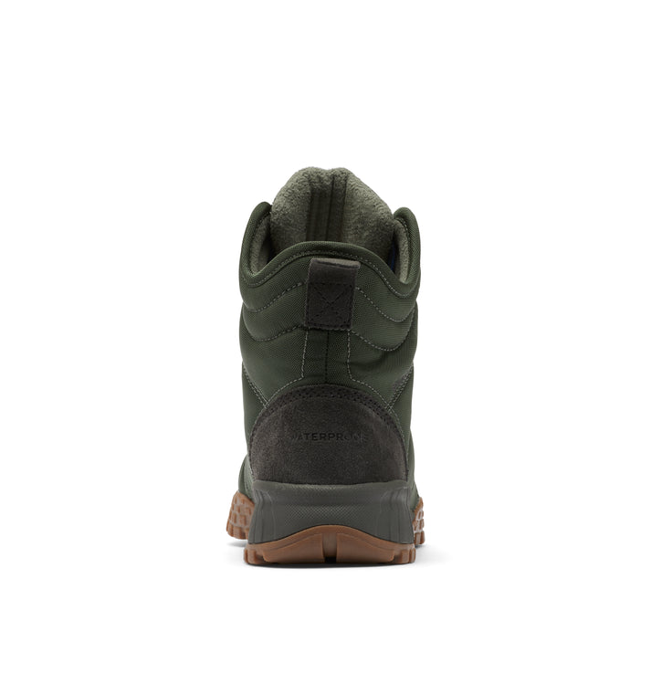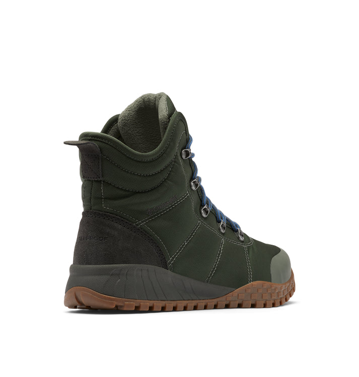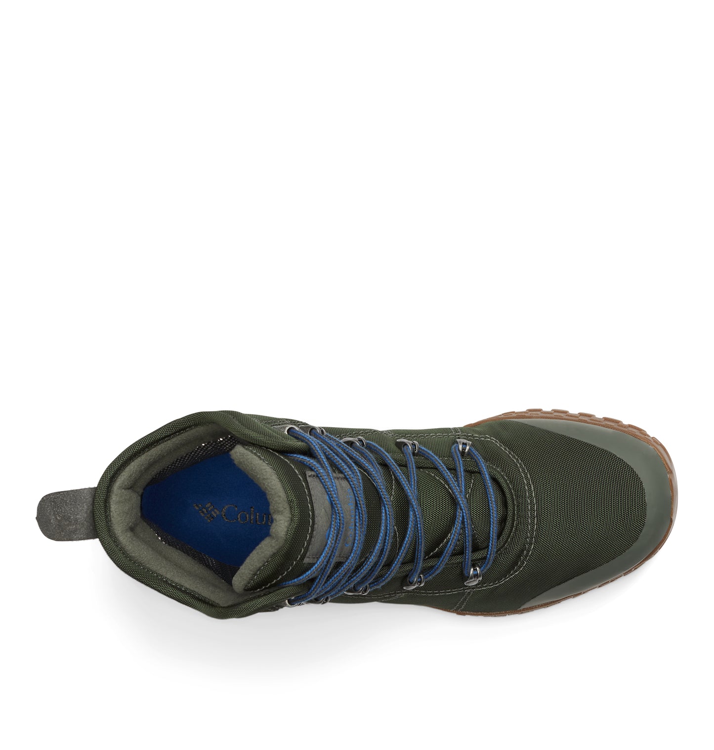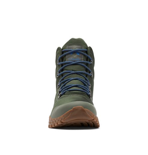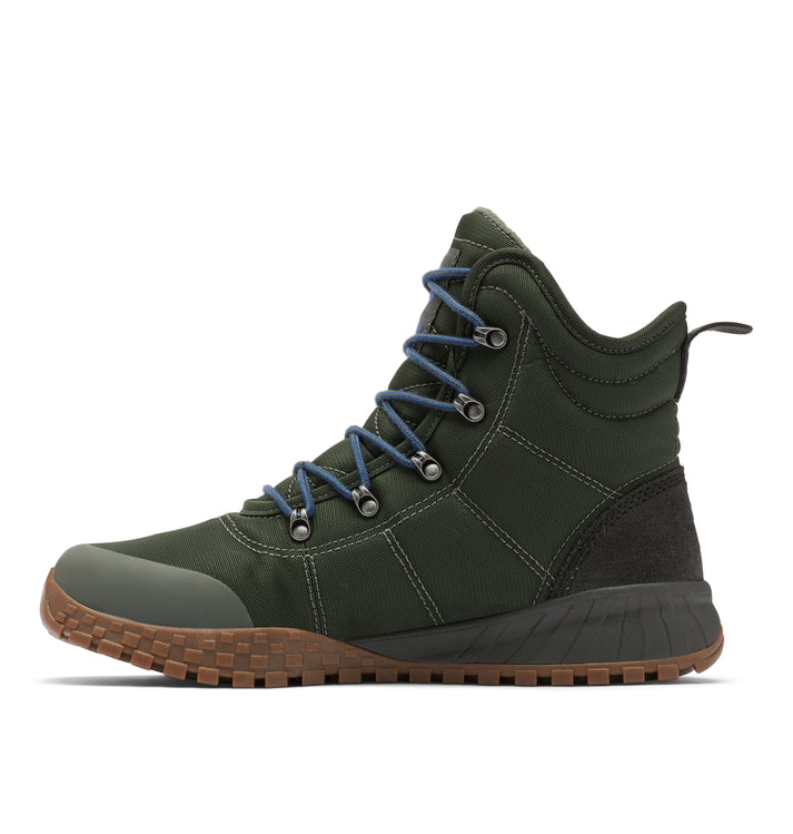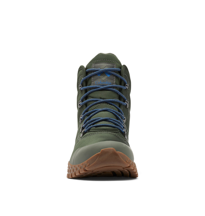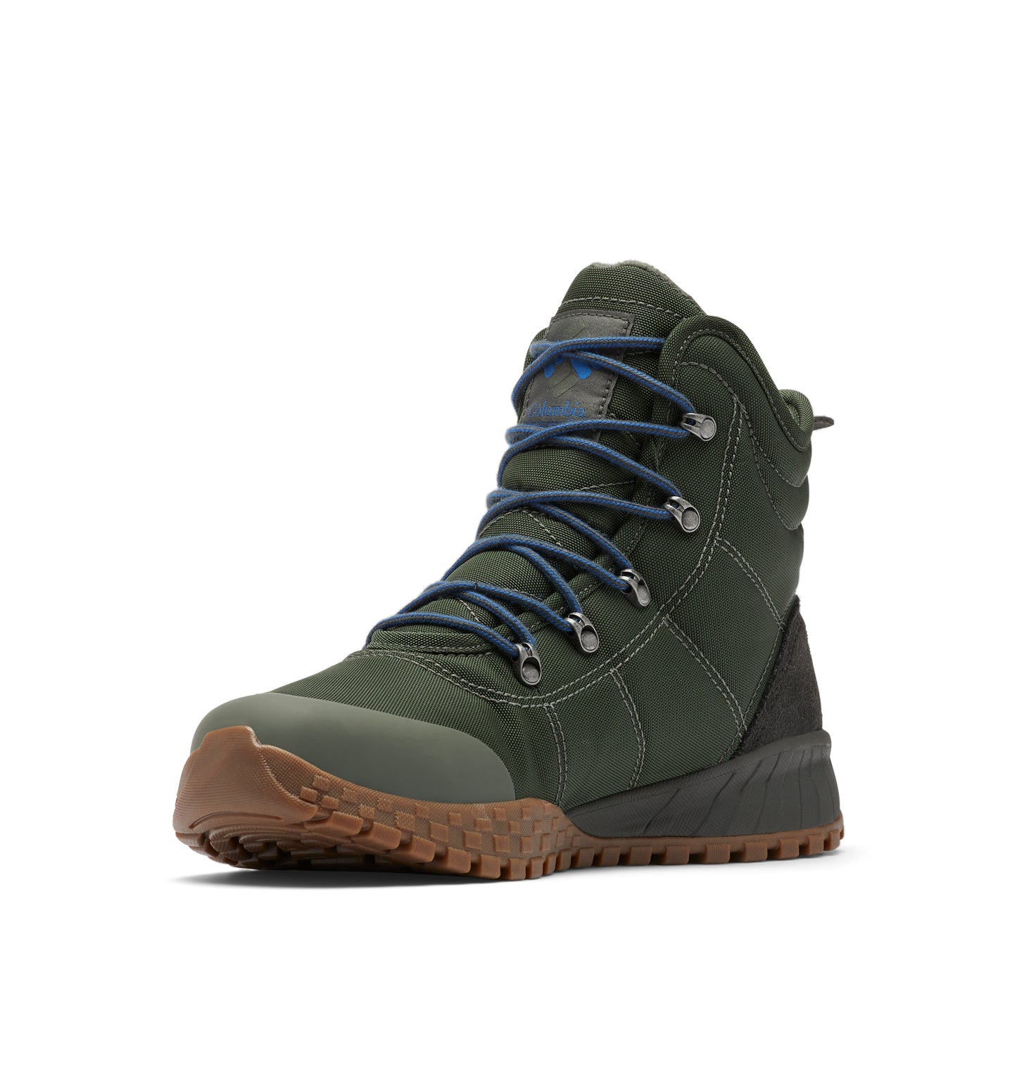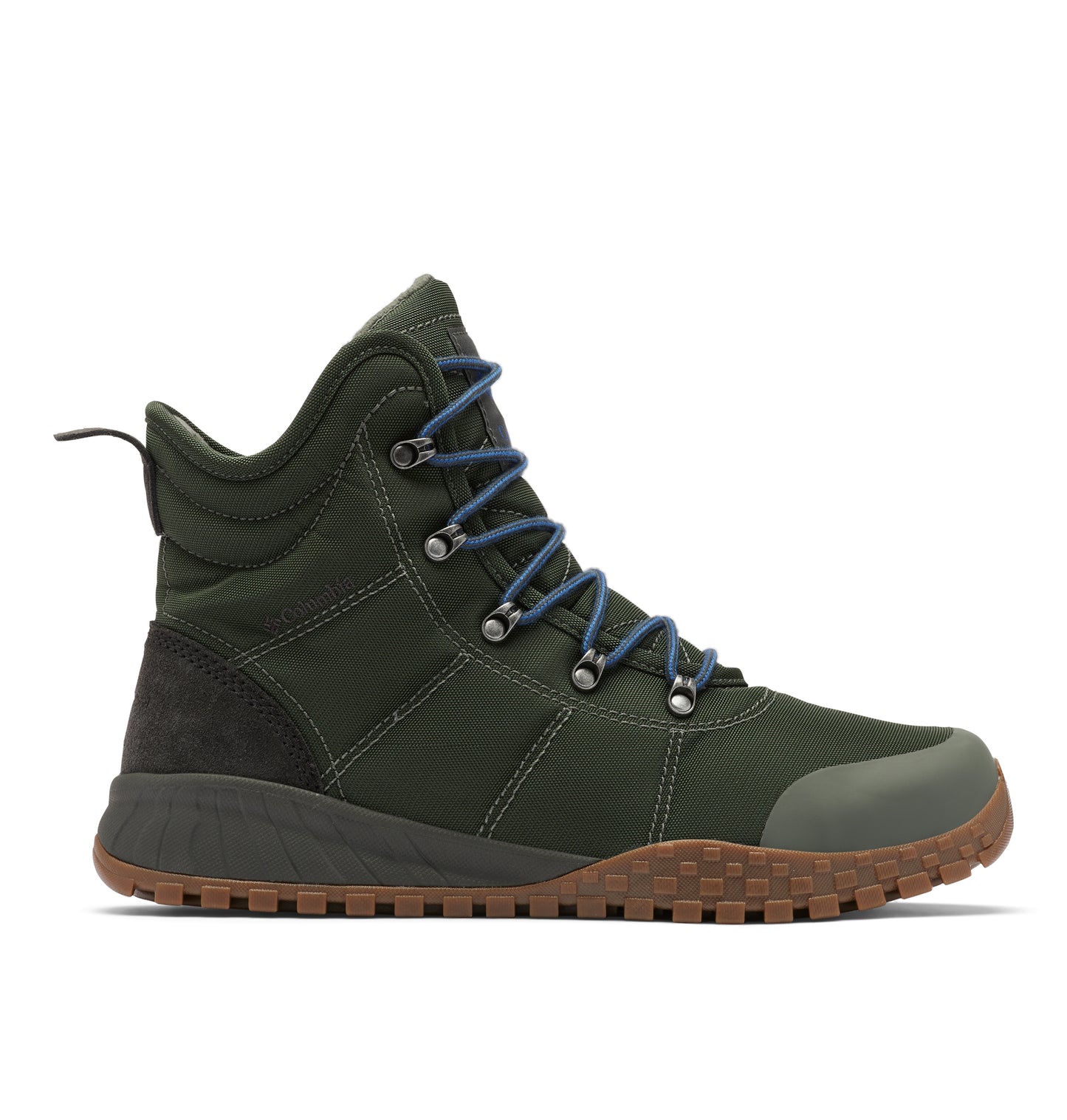 Olive green quilted ankle boot with blue laces and a brown lug sole.
