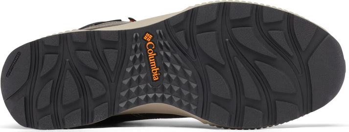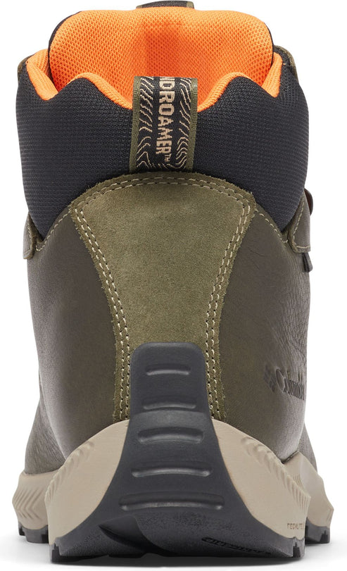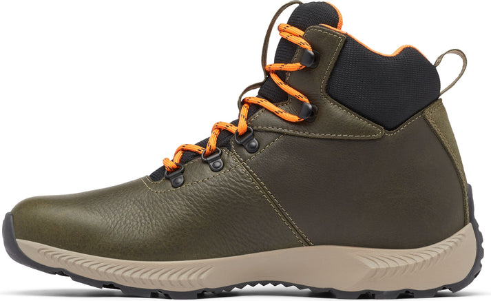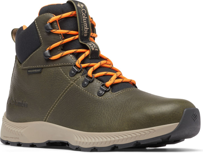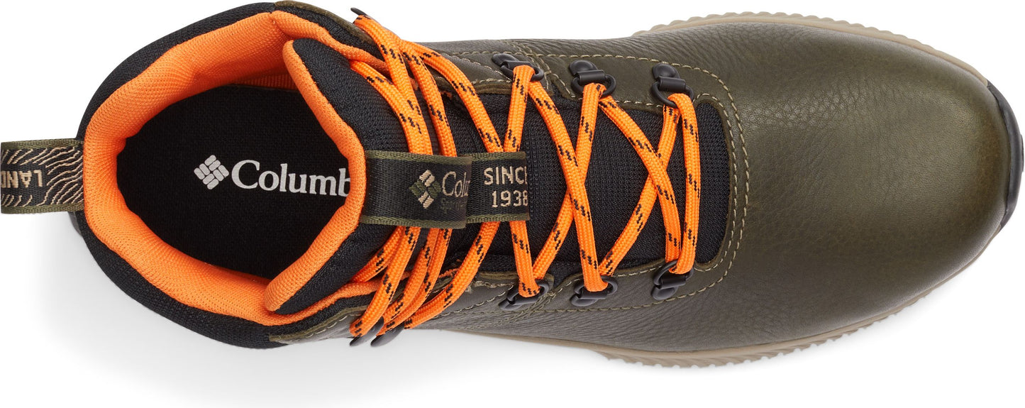Olive-green hiking boot with orange laces, black padded collar, tan sole and text "Columbia SINCE 1938" on tongue.
