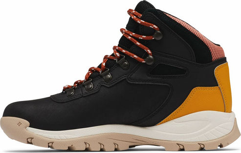Black hiking boot with orange and white laces, mustard yellow accent, and light beige sole.