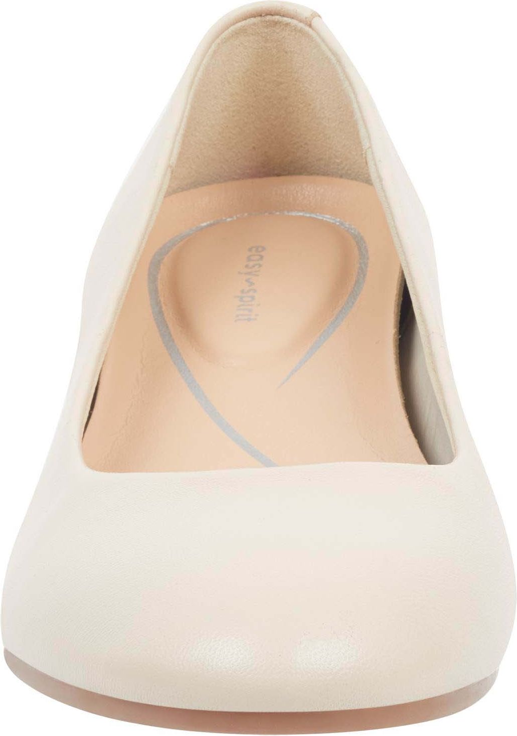 Beige pump shoe with a rounded toe and low block heel.