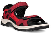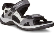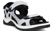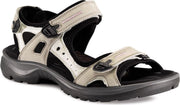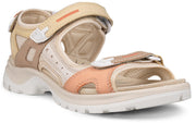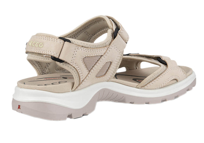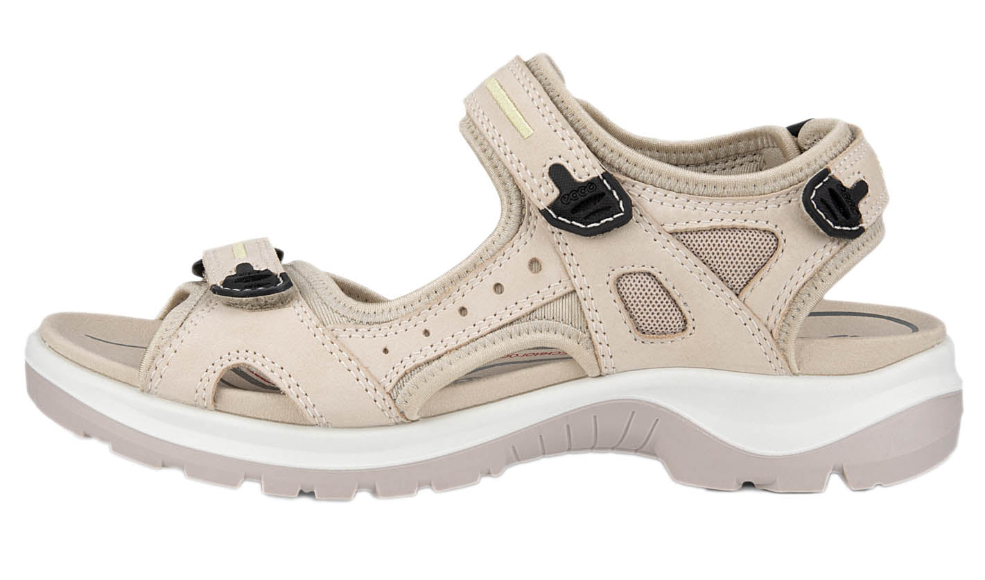 A tan sandal with adjustable velcro straps, white midsole, and black accents.