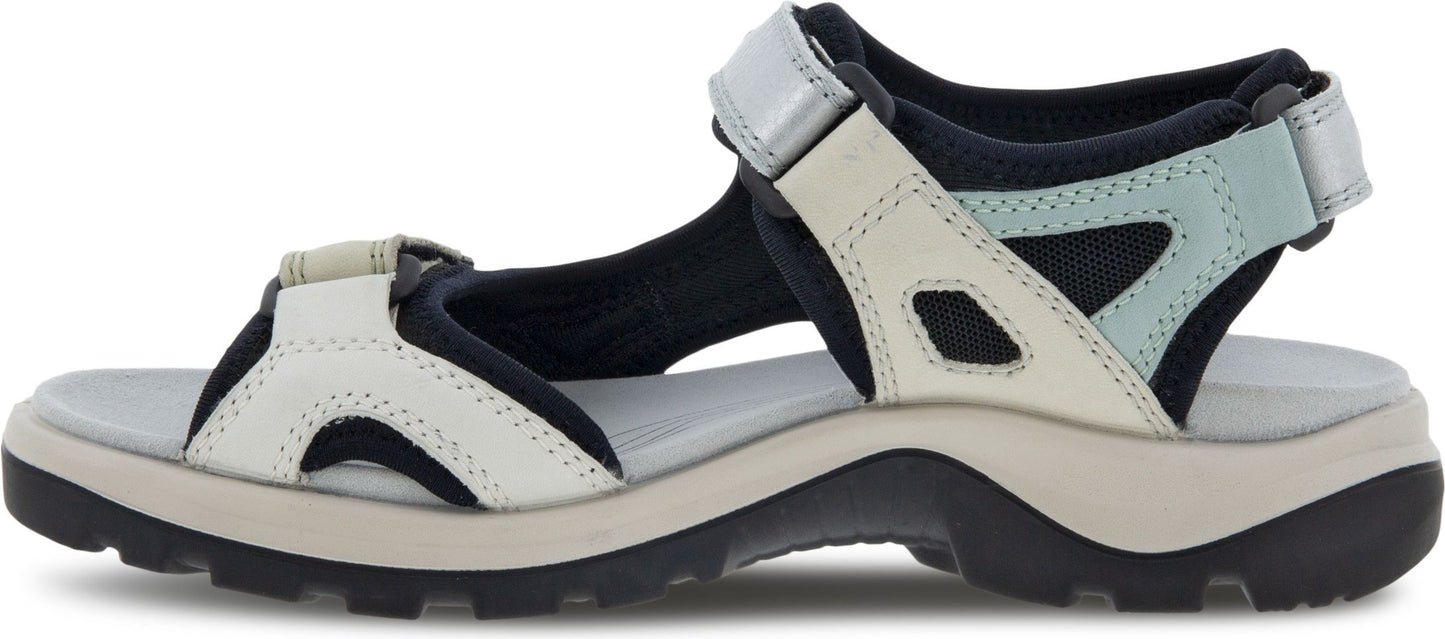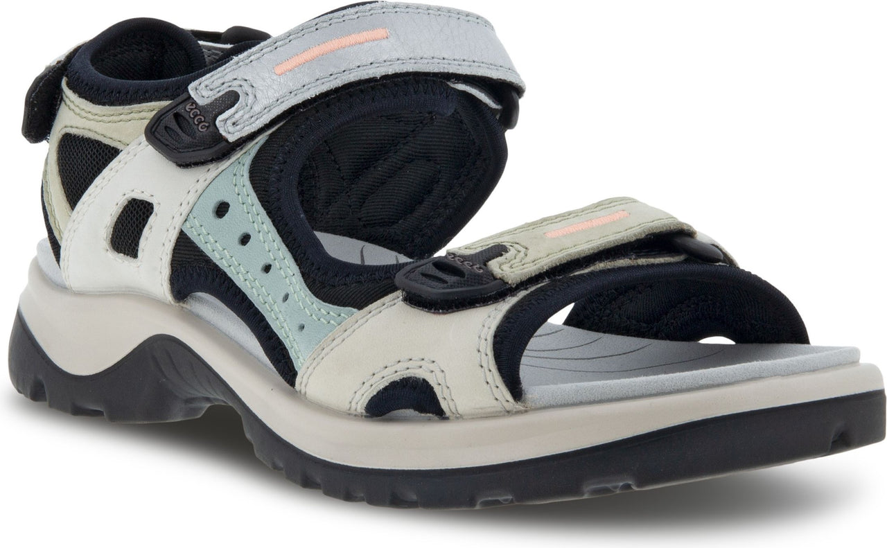 A sandal with adjustable velcro straps, thick sole, and a mix of light gray, black, and blue colors.