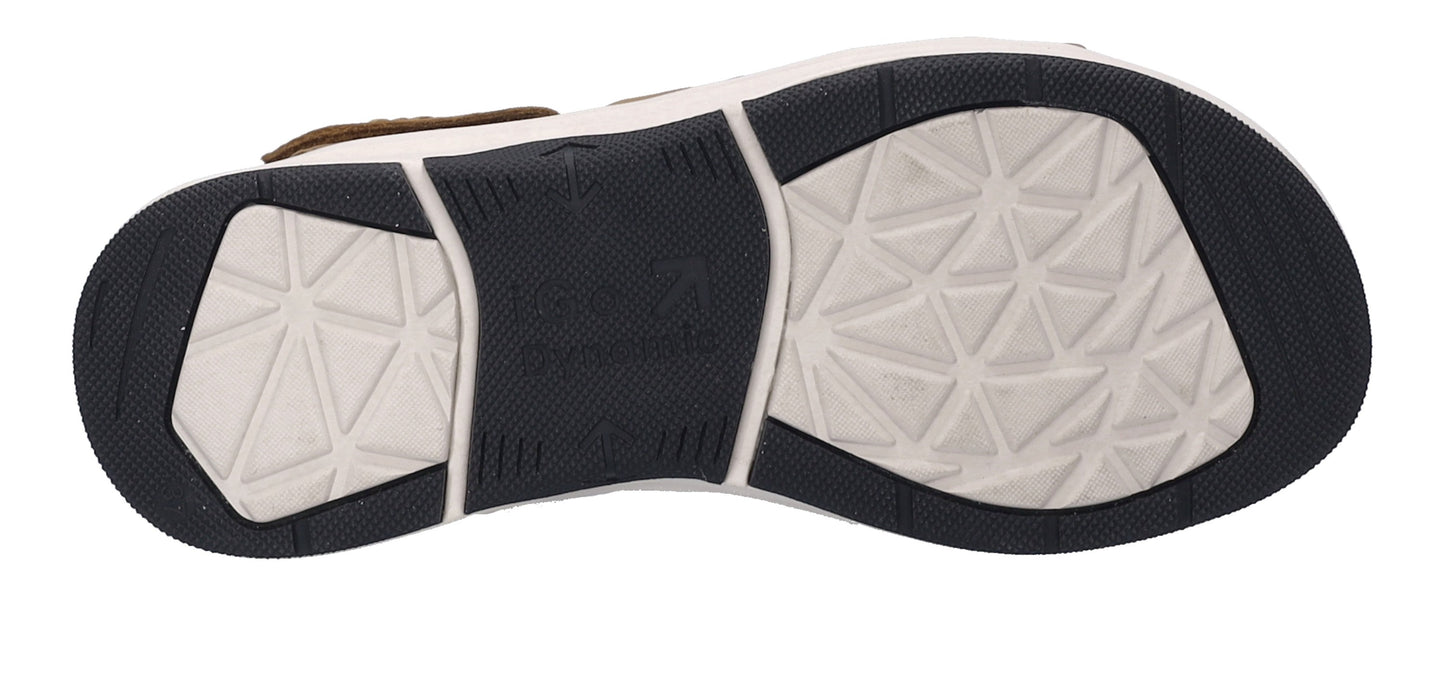 Tan sandal with crossover straps and a white platform sole.