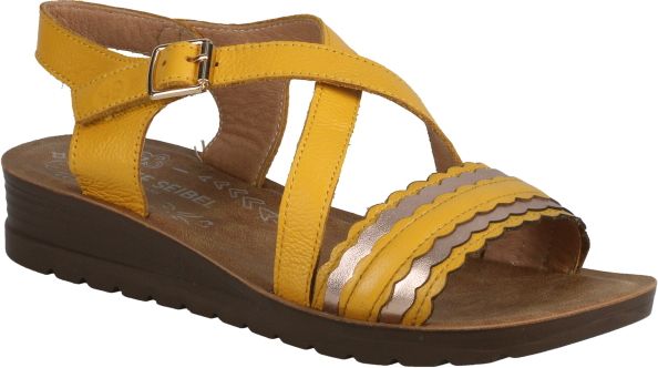 Yellow sandal with criss-cross straps, buckle, and wavy trim.