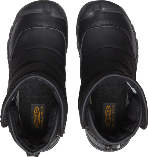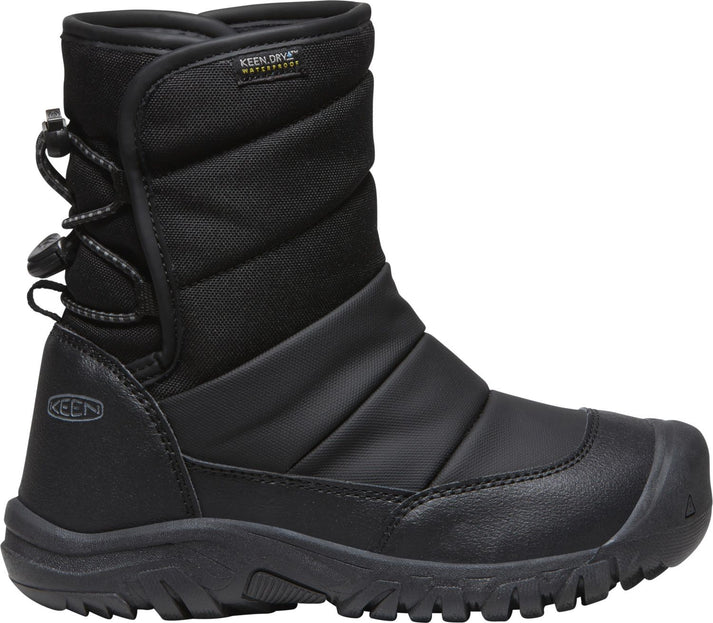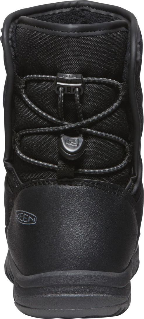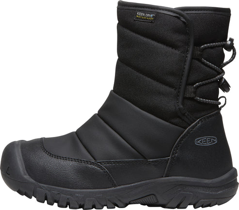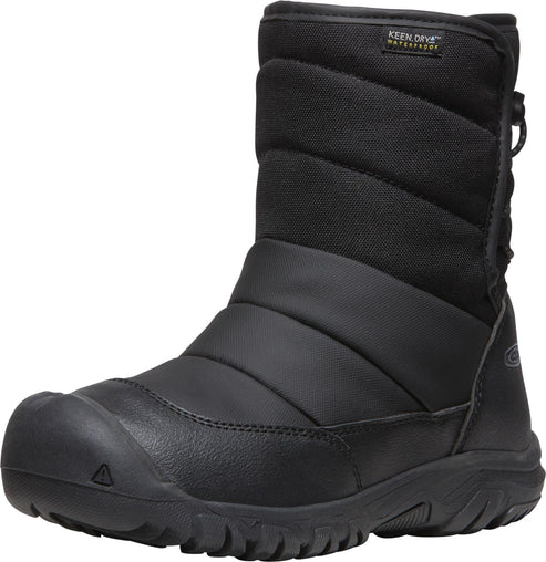 Black winter boot with drawstring closure, waterproof, and lug sole.