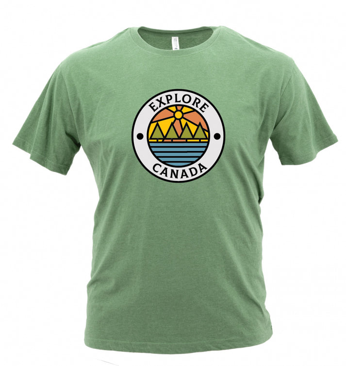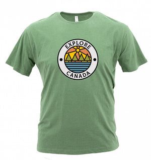 Green t-shirt with graphic design of mountains, sun and water inside circle with text "EXPLORE CANADA".