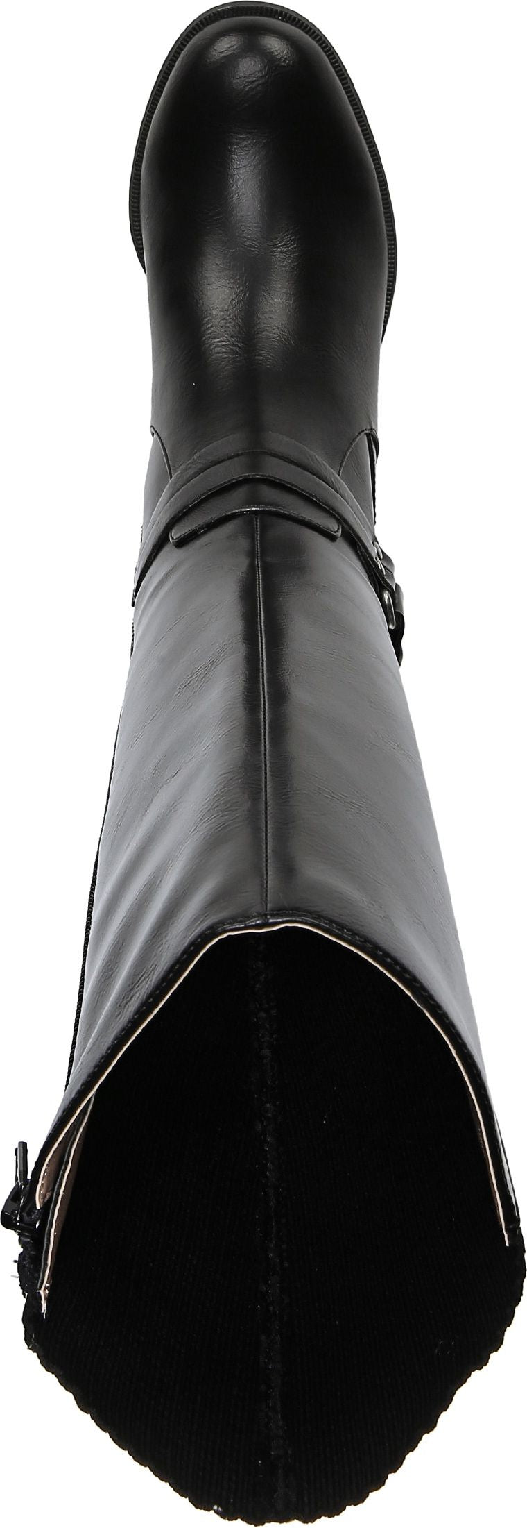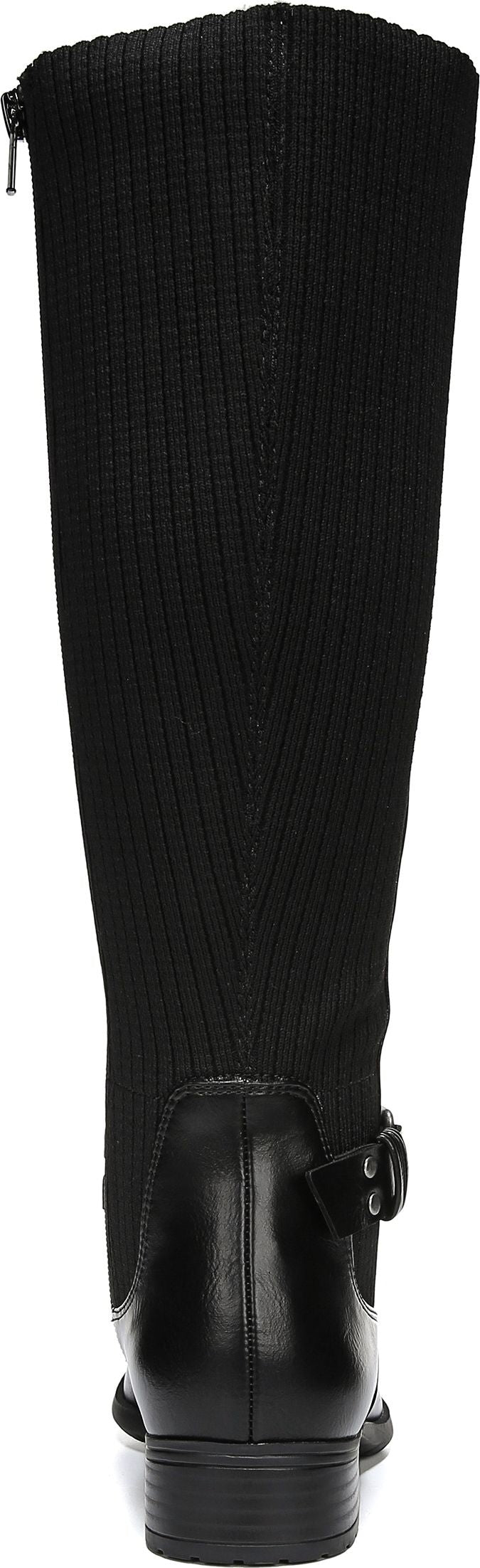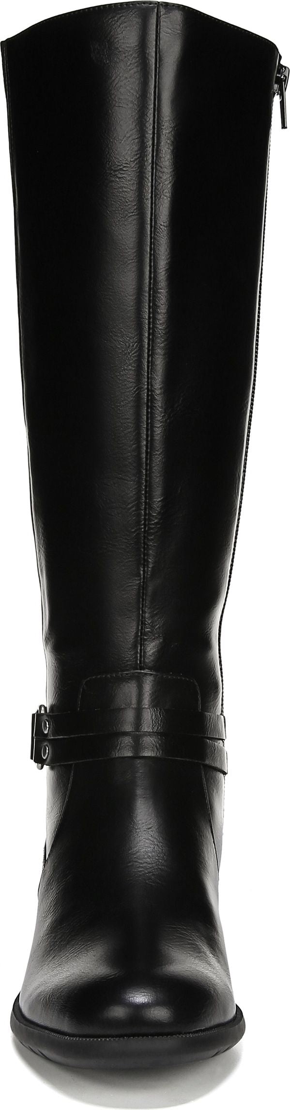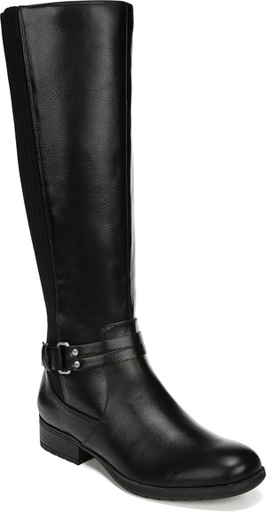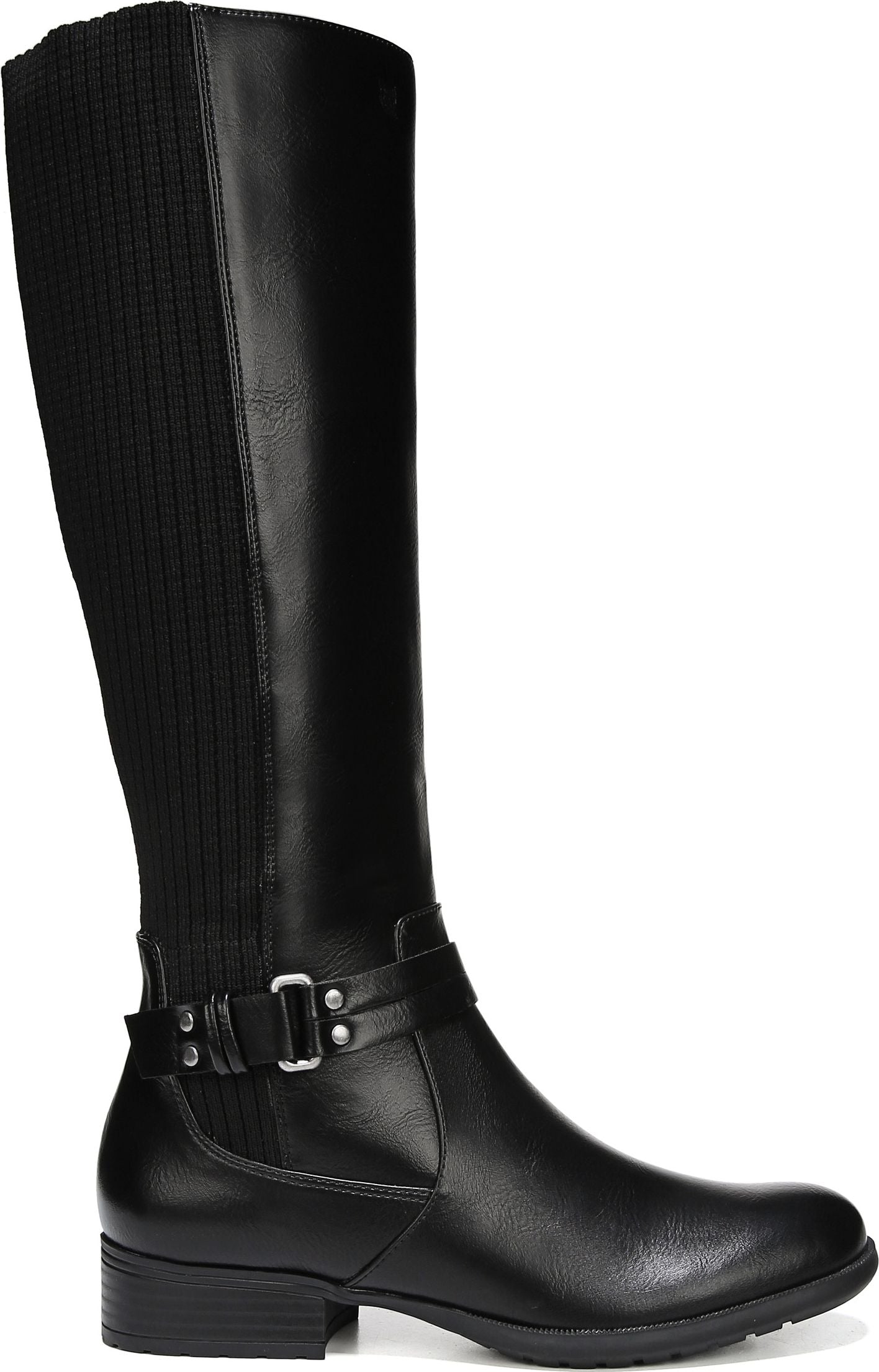 Cozy meets contemporary in this super comfortable, super stylish riding boot by LIFESTRIDE. Faux leather upper with a round toe, side zip closure, stretch knit panel for flexibility to accommodate wide calves, and decorative straps with metallic ornamentation.