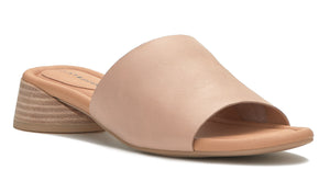Tan mule sandal with a short block heel and leather-like upper.