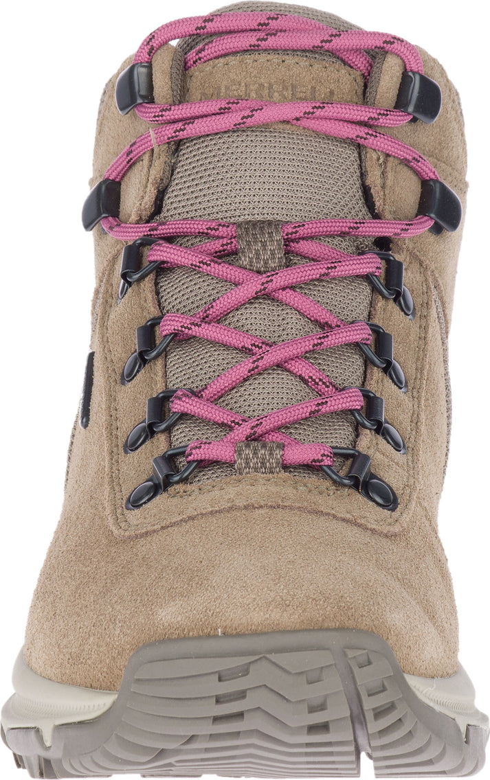 Tan suede hiking boot with pink laces and a white “MERRELL” logo on the side.