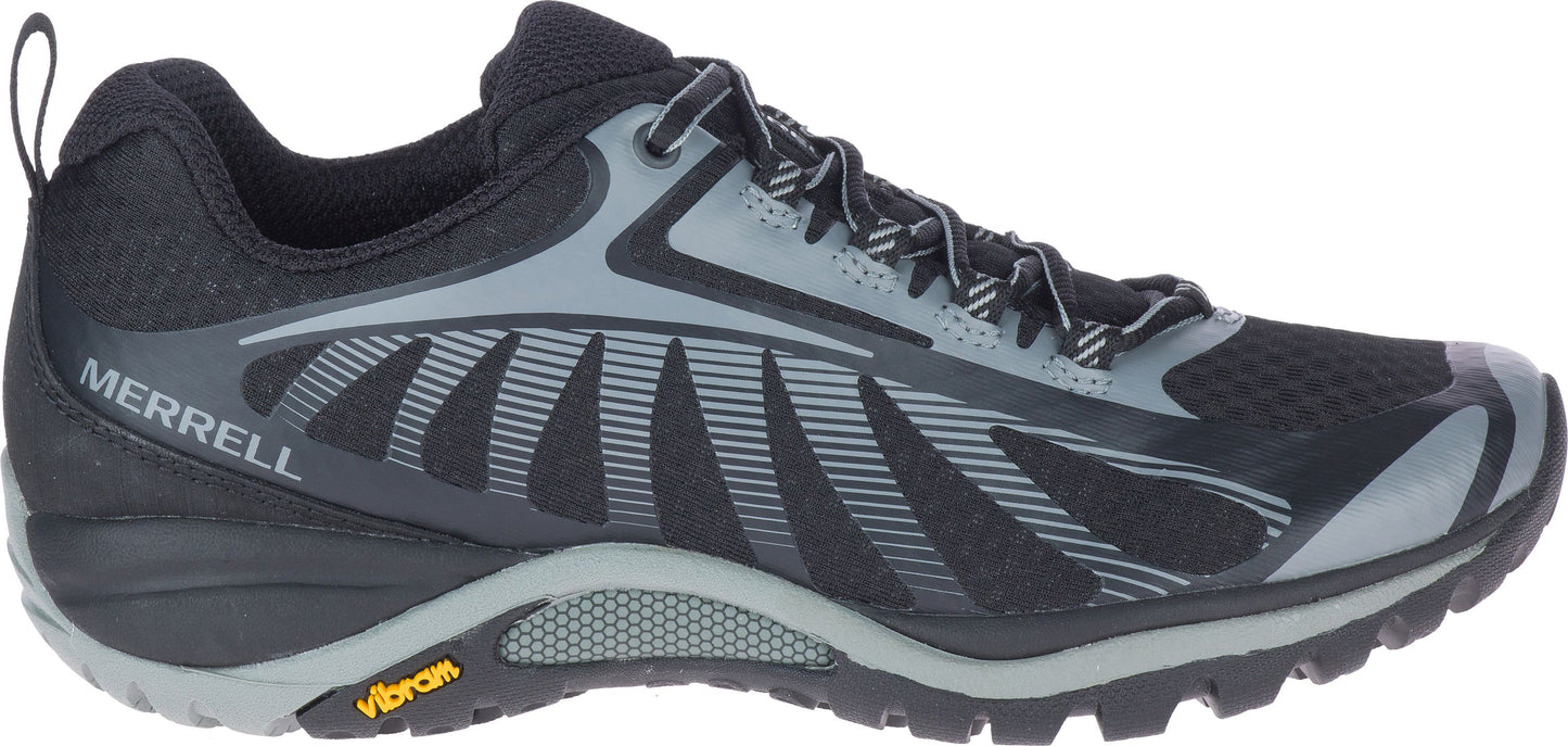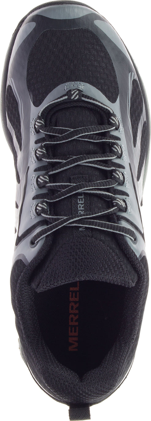 Black and gray athletic shoe with laces and "MERRELL" printed on the side.