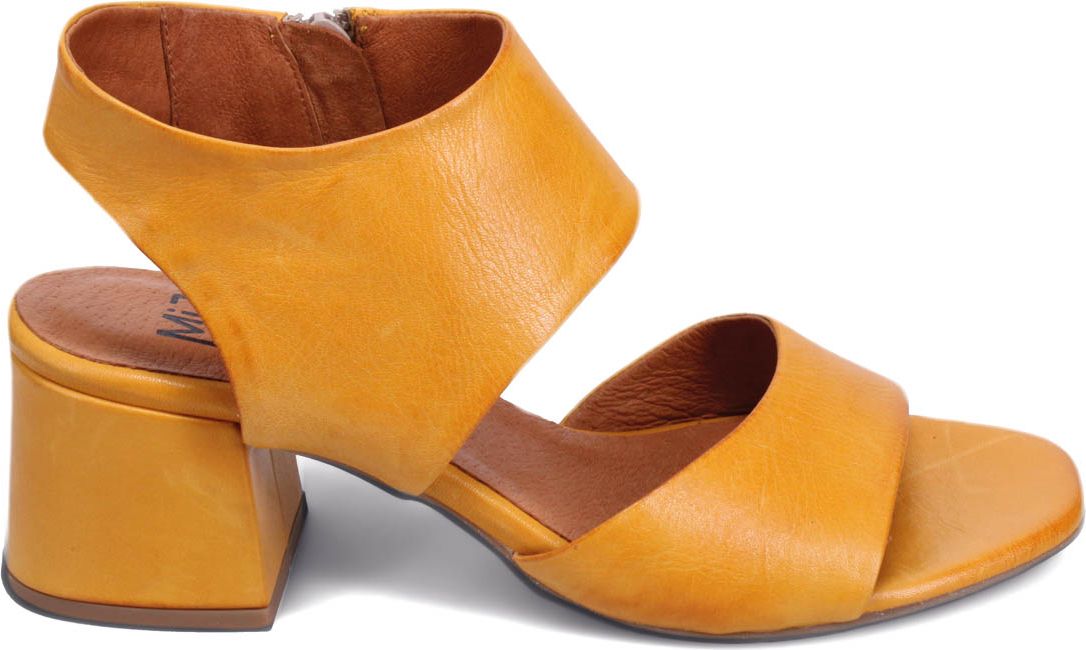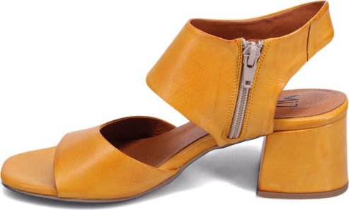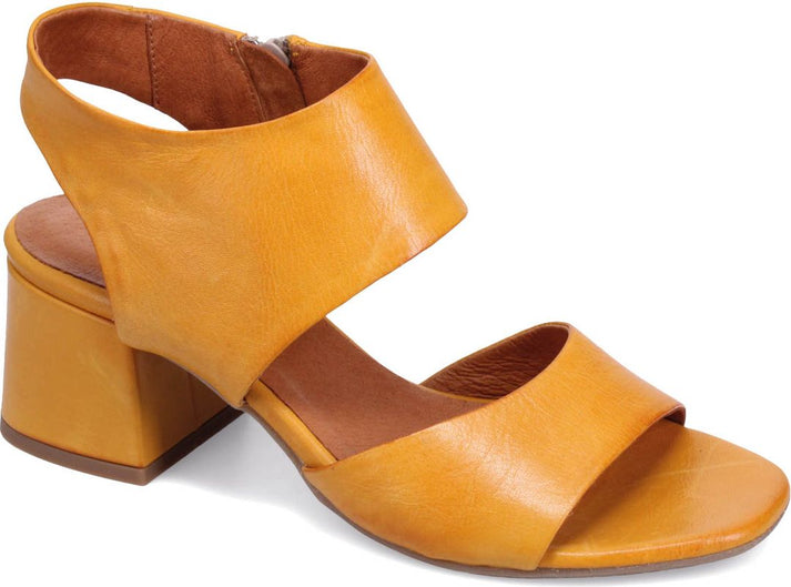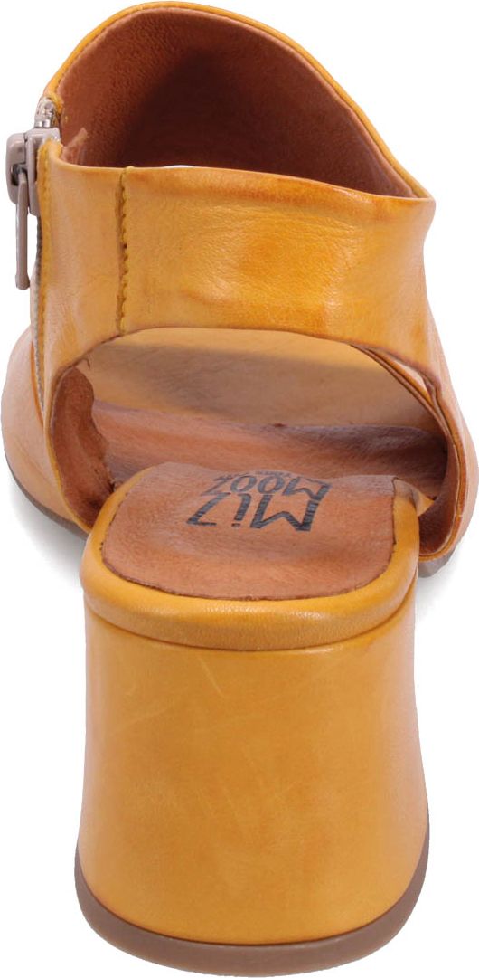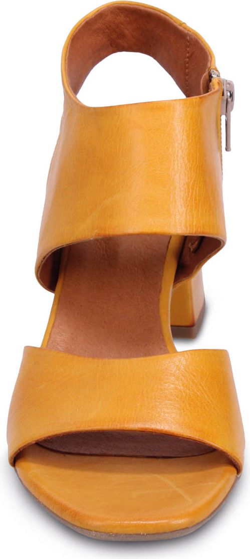 Mustard yellow leather heeled sandal with a closed heel and an open toe.