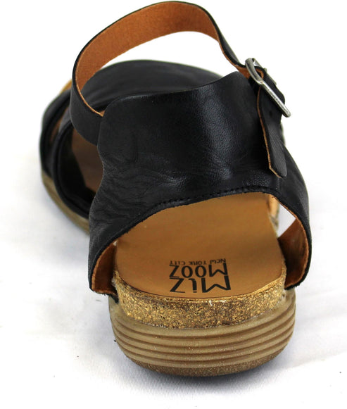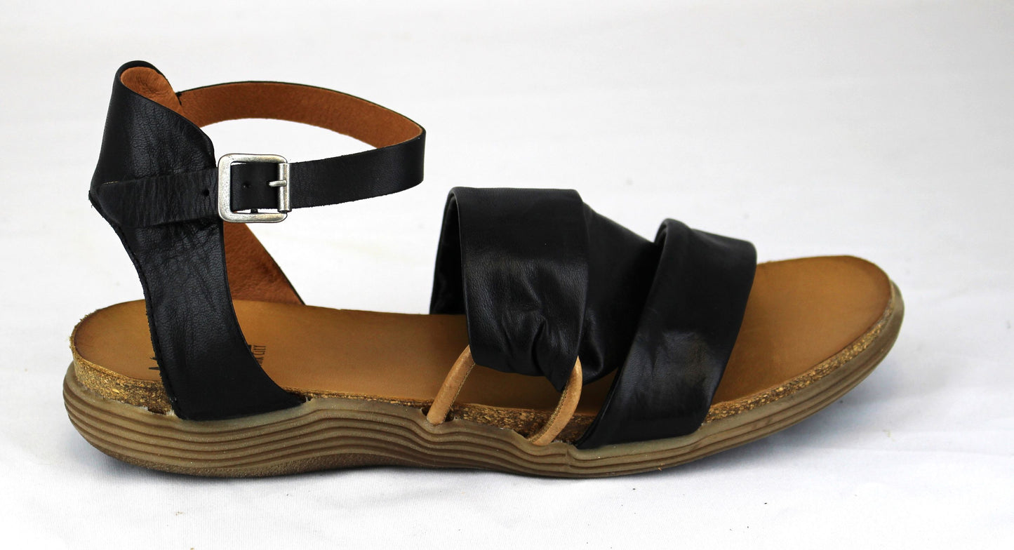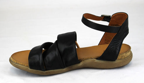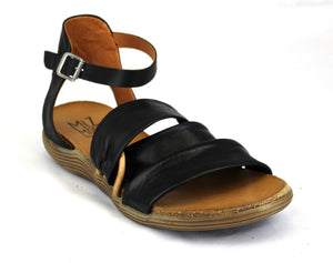 Black sandal with two wide straps across the top and an ankle strap.