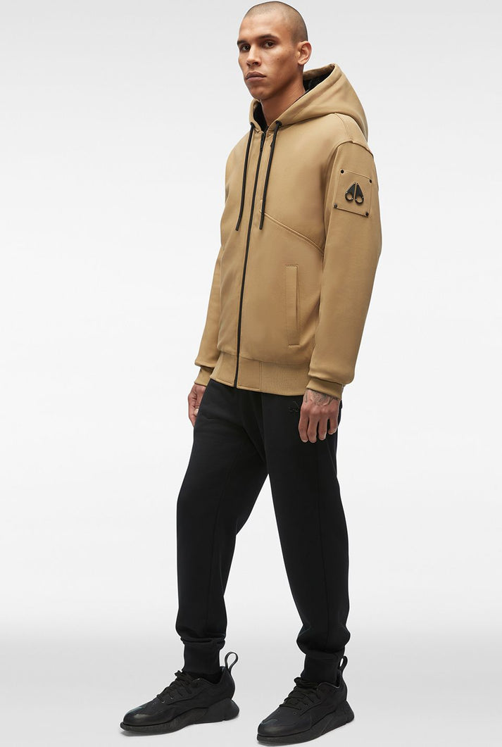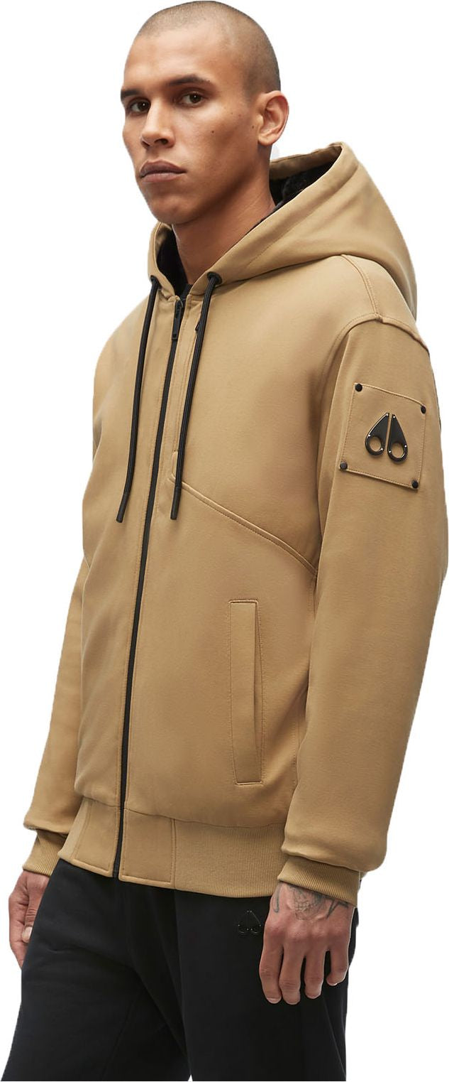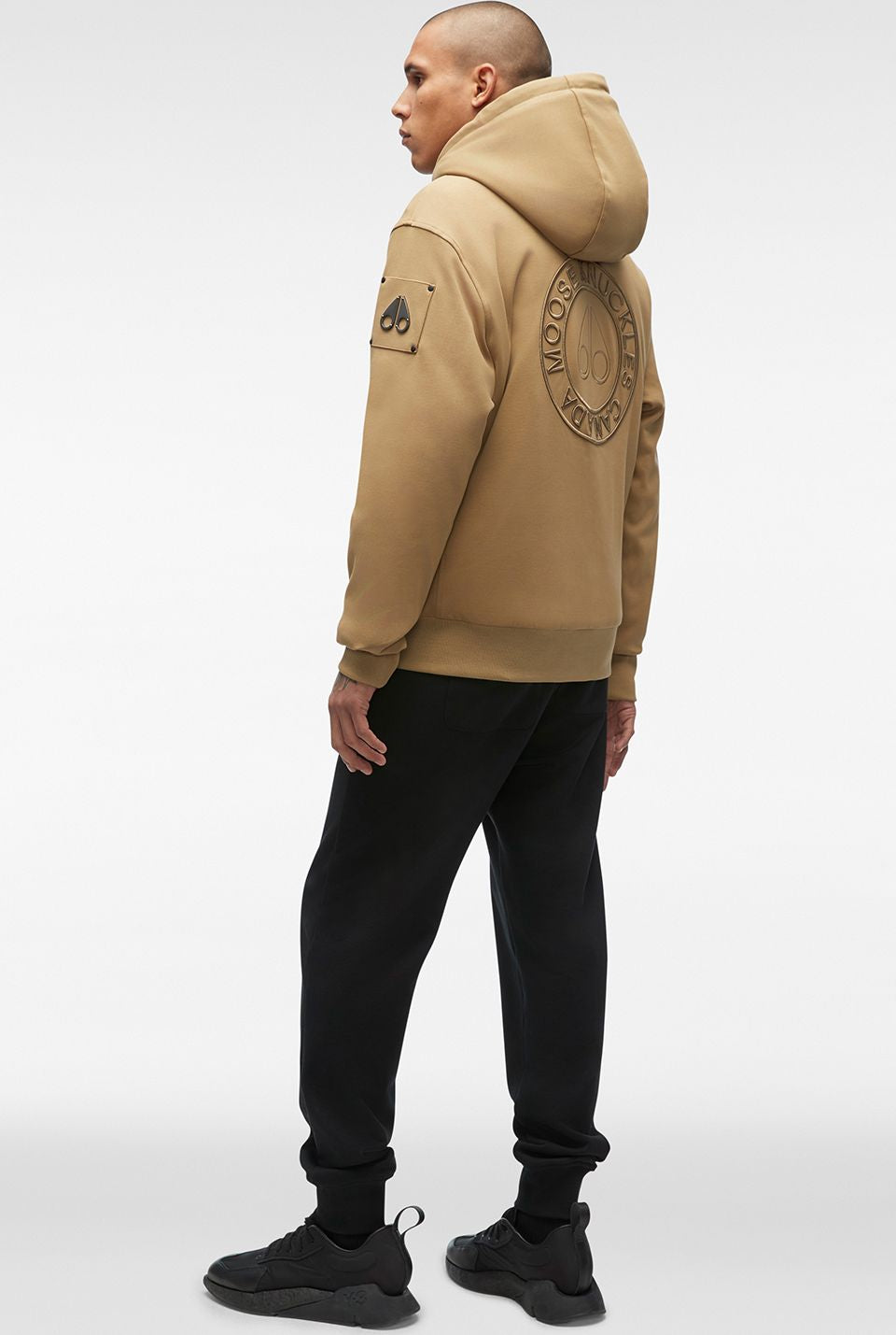 Tan hooded sweatshirt with black zipper and moose logo patch on left sleeve.