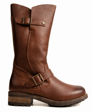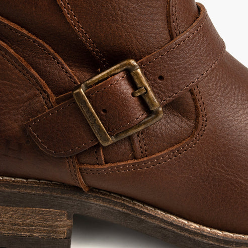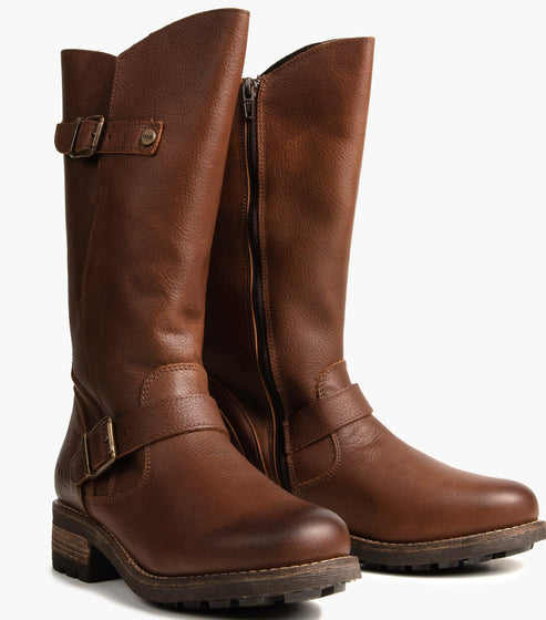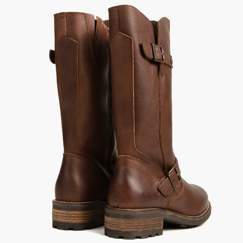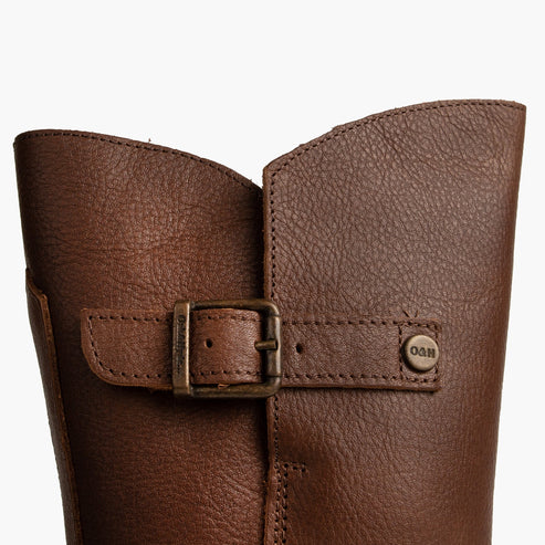 This is where it all began, with Crest. This classic tall leather boot was one of the first designs ever developed in our collection. Crest is a classic premium leather boot with angled lines along the top edge of the upper. The design features two 'Oak&Hyde' branded brass buckles, one at the top and one on the ankle position of the boot and the O&H brass pin is featured on the top side of the boot. On the inside of the upper of these country boots, there is an inside full zip for entry and easy fitting. The O&H logo is tastefully embossed on the heel of the boot and the lining is made from high-quality soft cotton which has a traditional check pattern design. This tall leather boot takes some inspiration from biker boots with buckles and this boot has a strong sole which is made from high-quality rubber and has a deep tread which gives it a superior grip. There is a leather insert fitted to the heel to give it a premium look and feel. Inside the boot also hosts a soft foam and leather insole which gives comfort. This timeless boot features a premium leather welt stitch detail which gives it character and an all-time classic quality look. Crest is our most iconic boot in the collection and is seen as a quality every day, wear anywhere, classic.