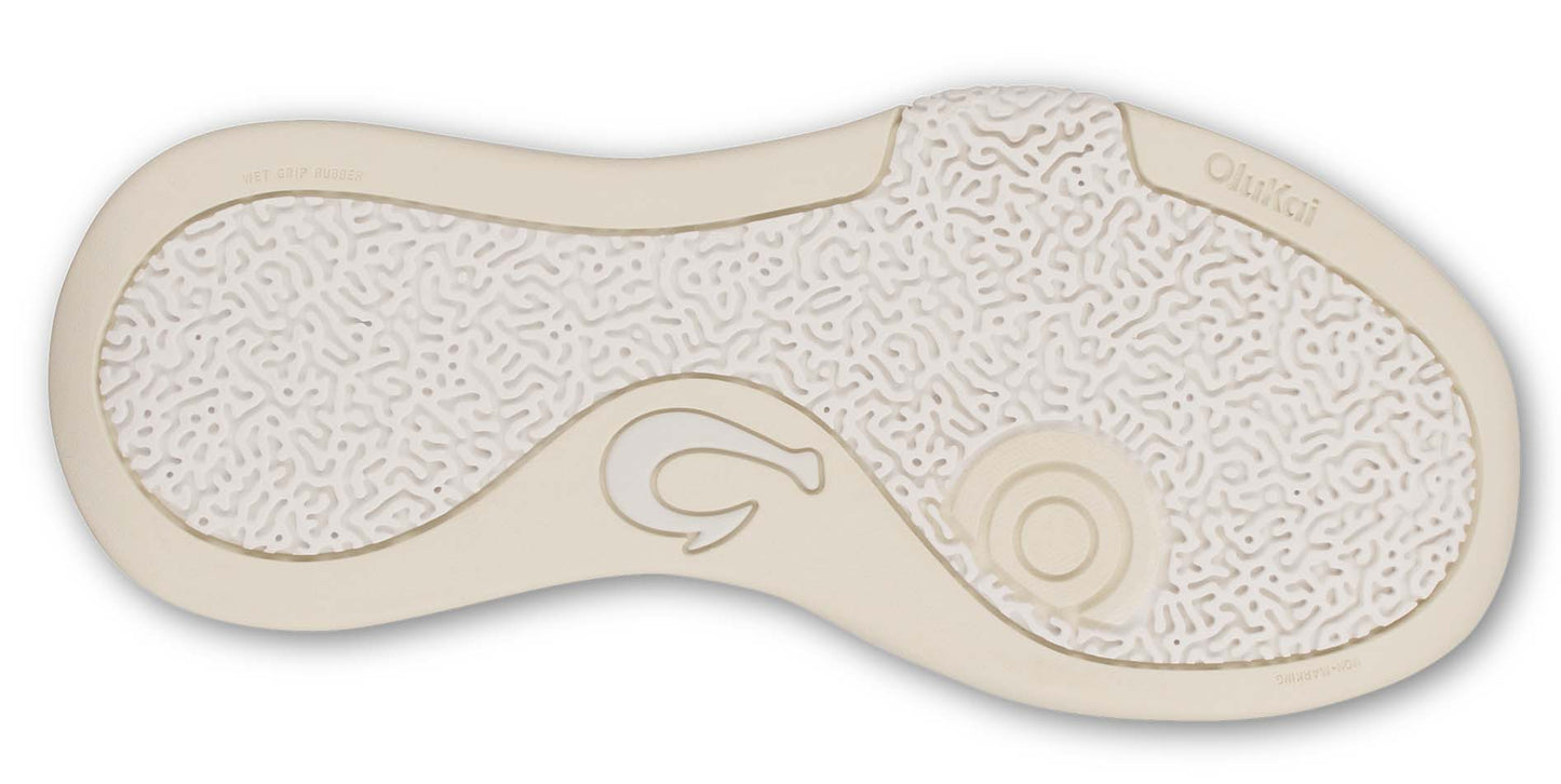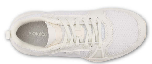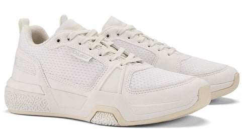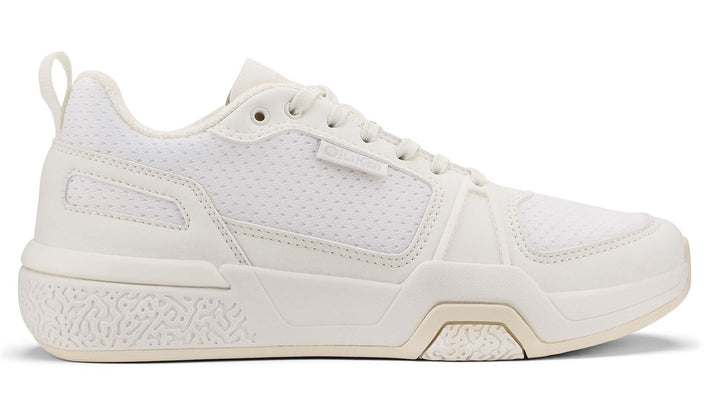 Side view of an all-white sneaker with a mesh upper, lace-up closure, chunky sole, and a pull tab at the heel.