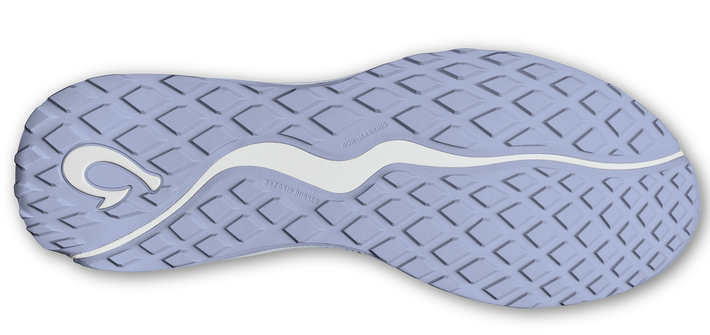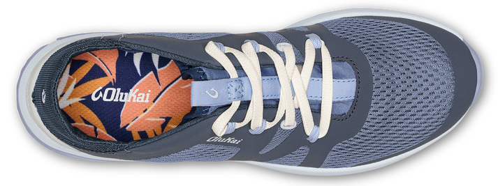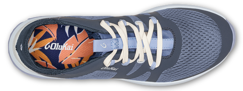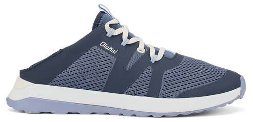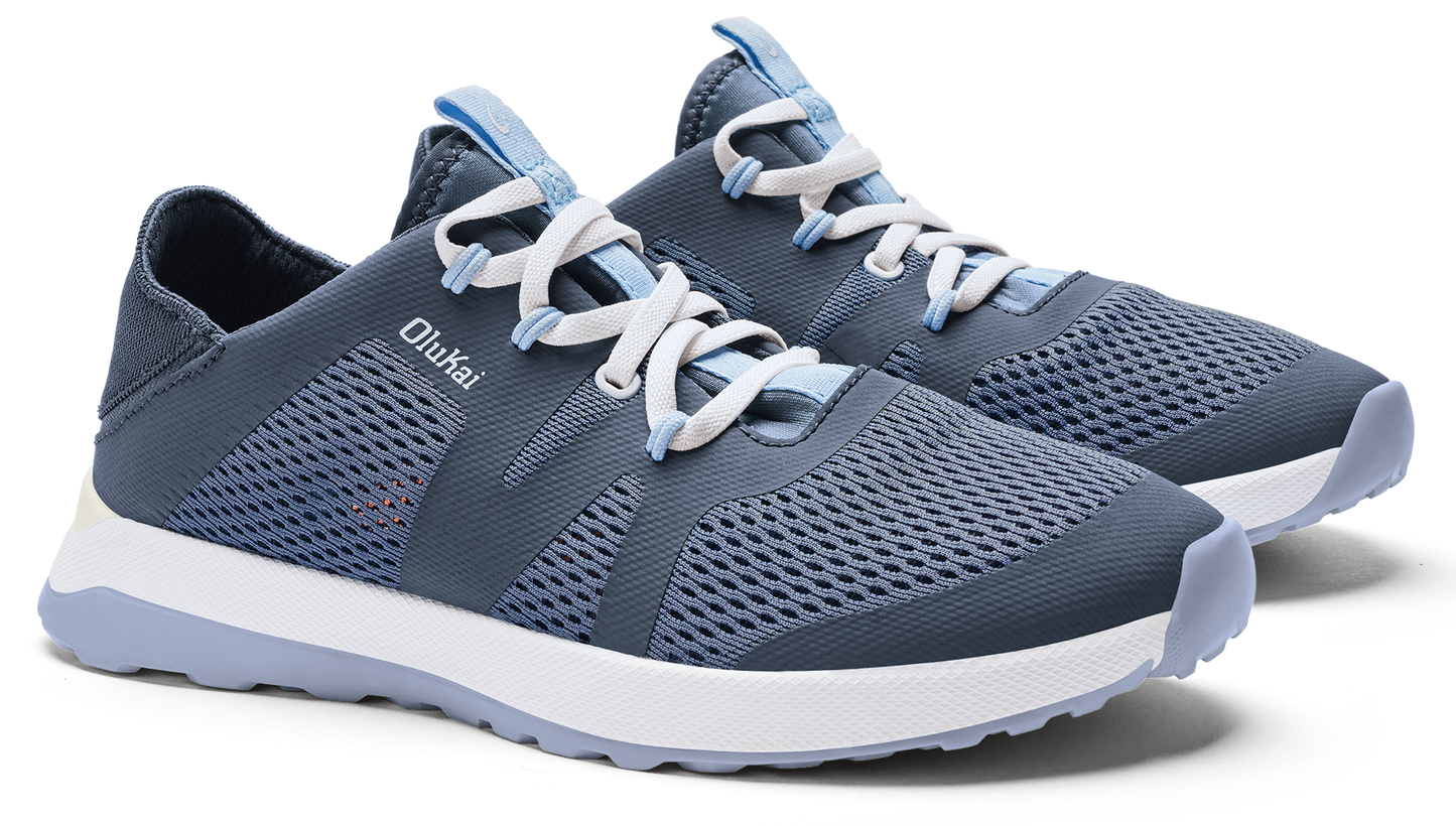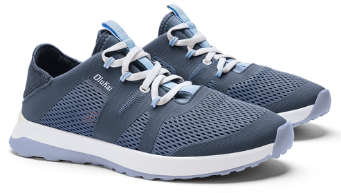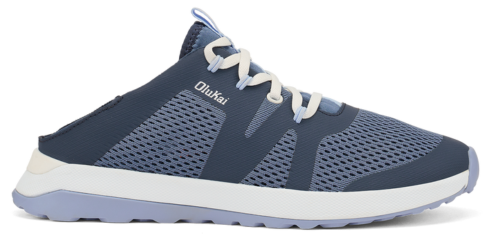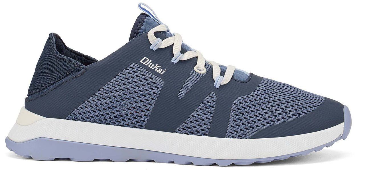 A blue mesh athletic shoe with white laces and a white and blue sole.