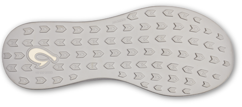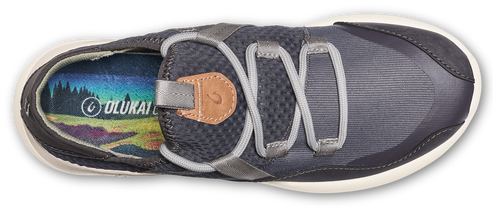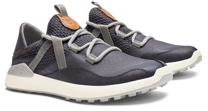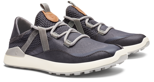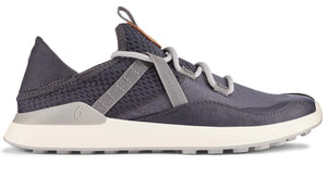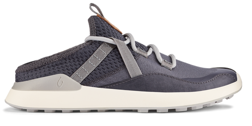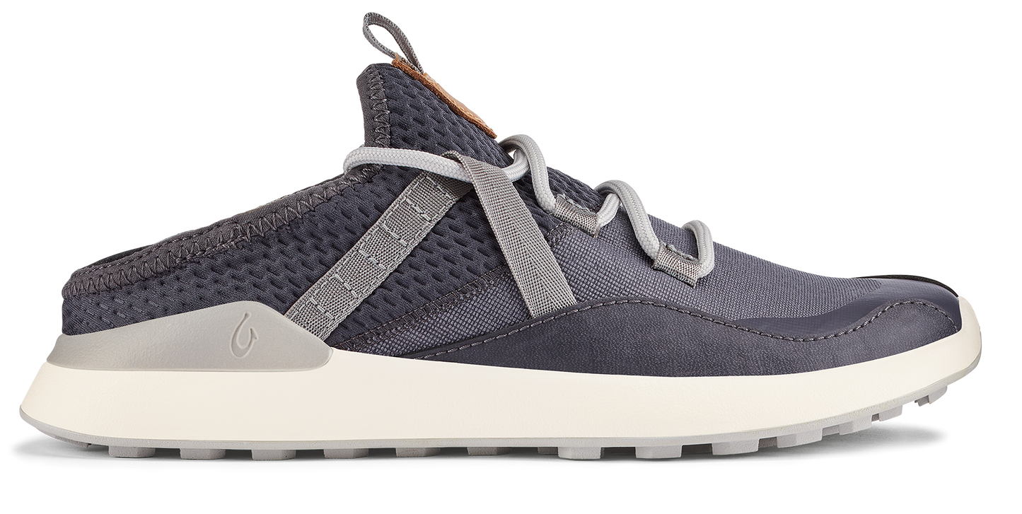 Side view of a gray sneaker with a white sole and a complex gray lacing system.