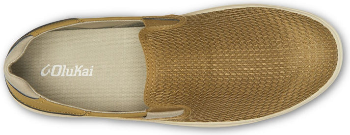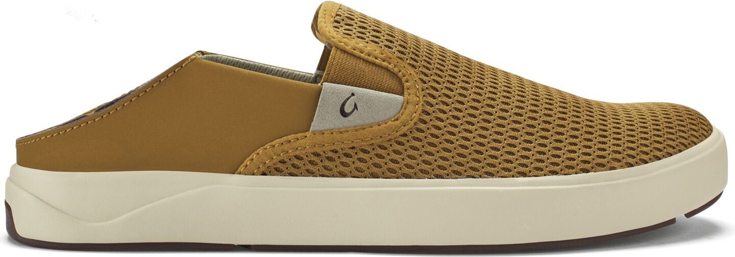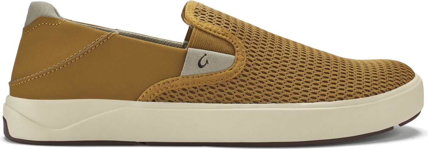 A slip-on shoe with a mesh front and tan accents on a cream sole.