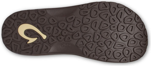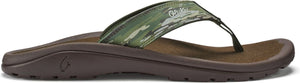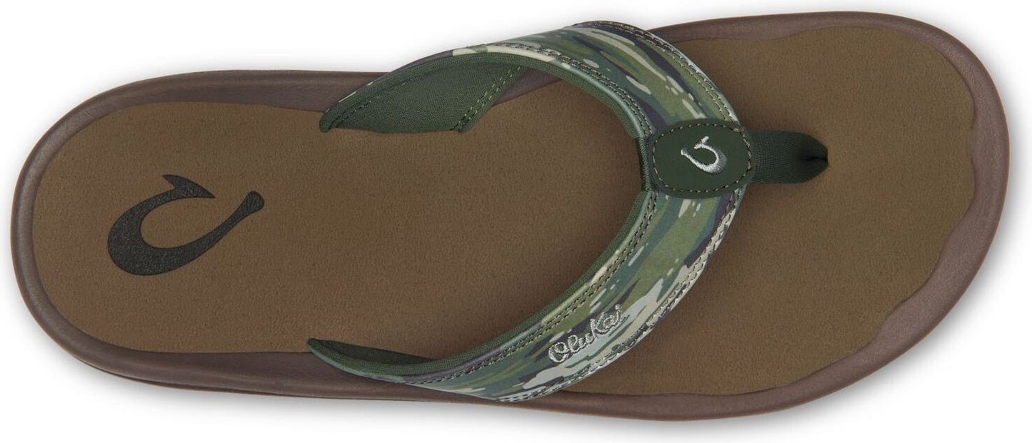 A flip-flop with a green camouflage strap and a dark brown sole.