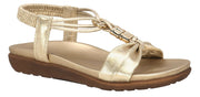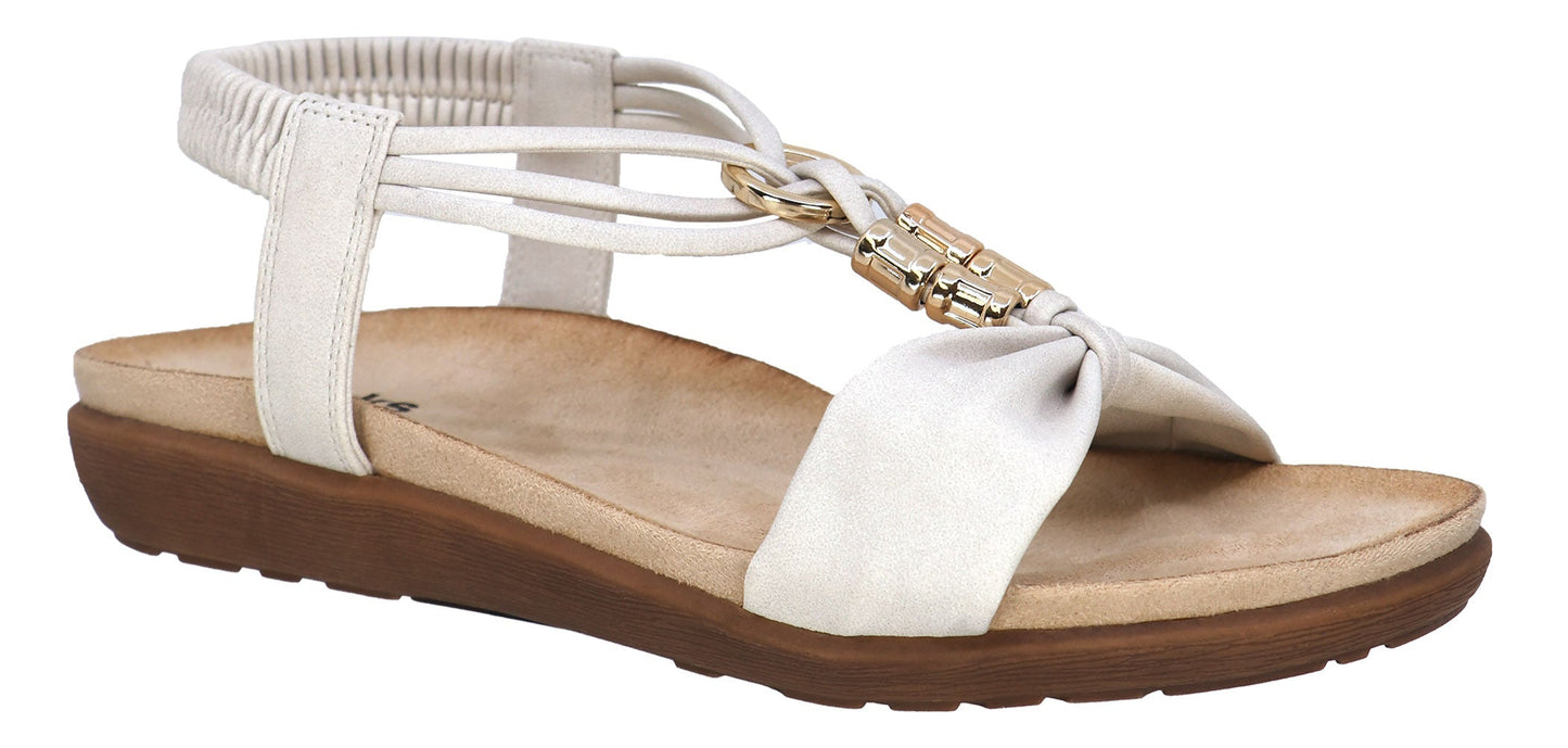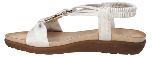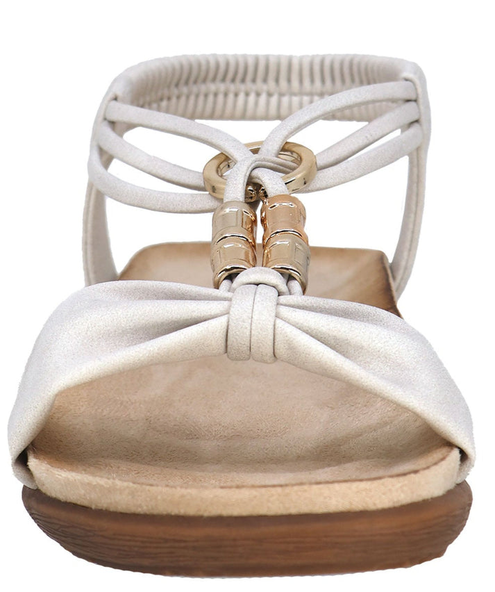 A white sandal with a brown sole.