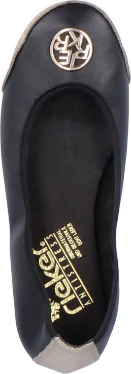Comfort combined with style. These Rieker Ballerina Slip On guarantee heavenly comfort when worn. The top is decorated with a metallic part in the front part and a decorative gold-colored buckle on the instep. The soft leather insole ensures that the shoe always fits and adapts to the foot. Not only for work, but also for parties, you will appreciate their comfort and modern look.