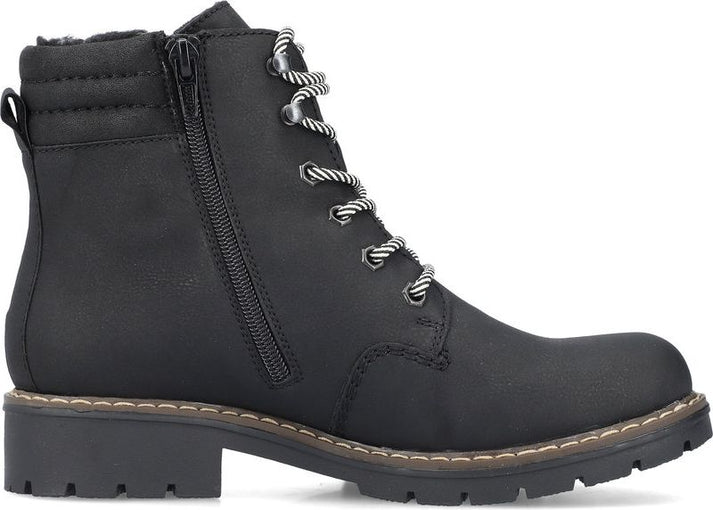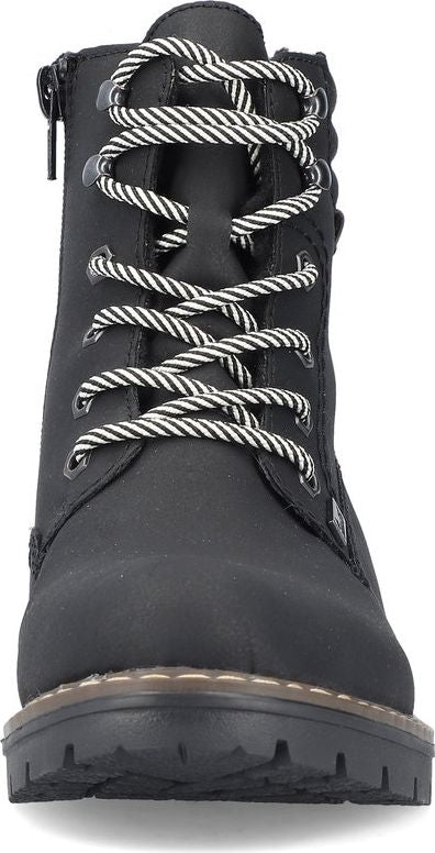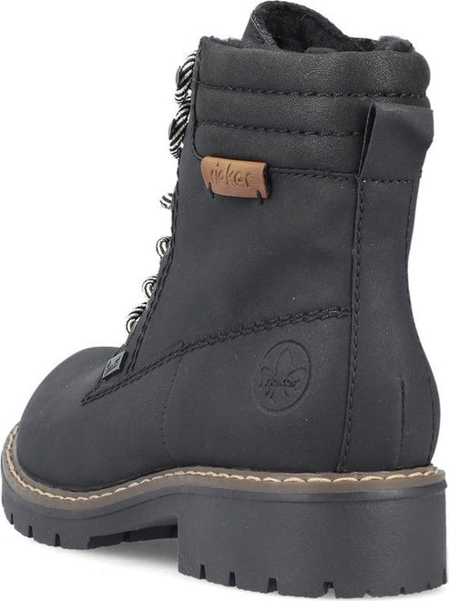 Stay stylish and comfortable this winter with our Black Hiker boots from Rieker. These high ankle boots are a wardrobe essential for those cold and unfavorable weather days. The soft synthetic upper is adorned with Rieker logos and contrasting laces, giving them a fashionable touch. Plus, the convenient zipper makes putting them on a breeze.