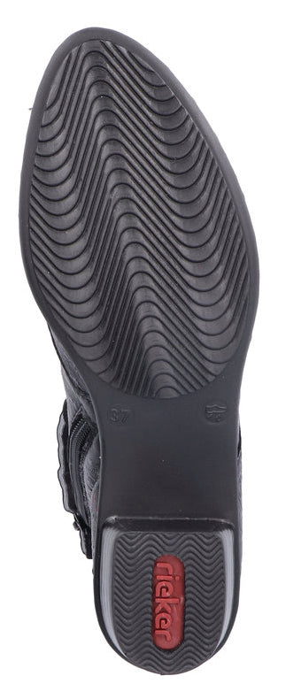 A black, ankle-high boot with a red floral pattern, a lace-up front, and a low heel.