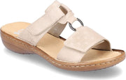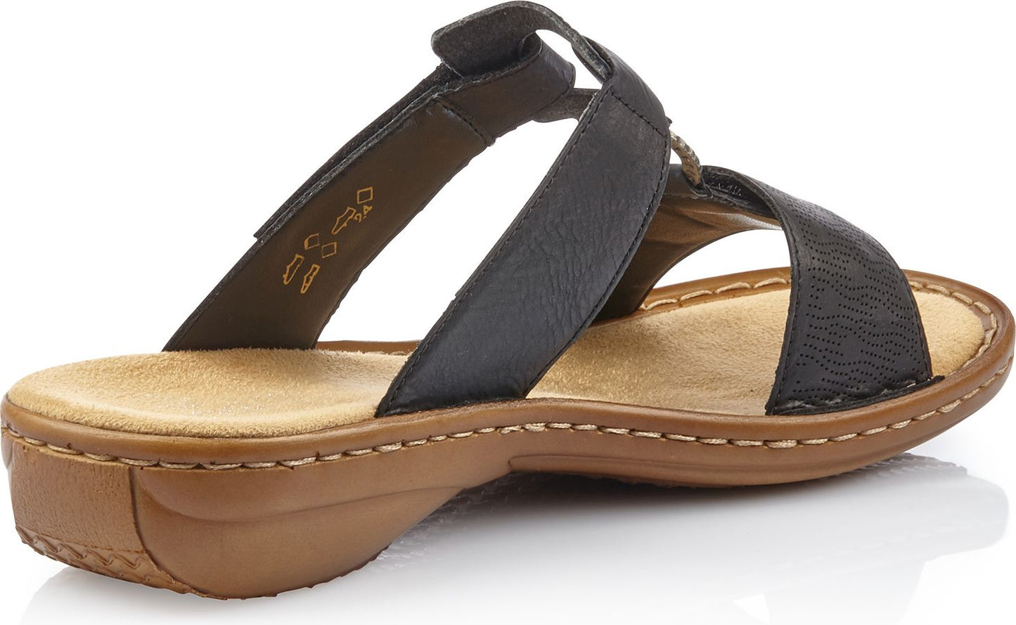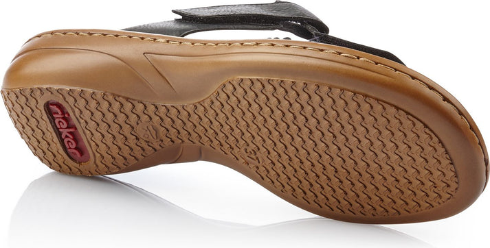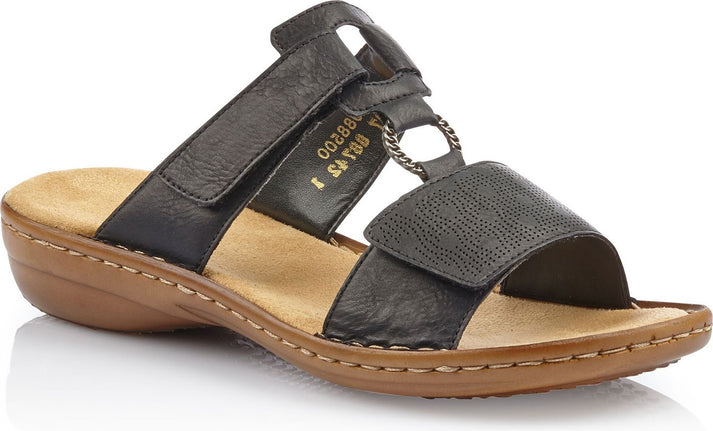 Step into style and comfort with these women's Rieker Black Slide Sandals. Crafted with exceptional attention to detail, these sandals feature a synthetic upper adorned with stitching and metal ornament details, giving them a fun and feminine look. The Velcro straps ensure a snug yet flexible fit, while the cushioned footbed, covered in leather, offers all-day comfort and support.