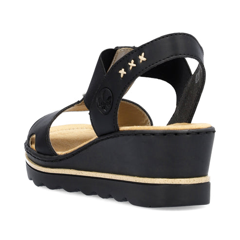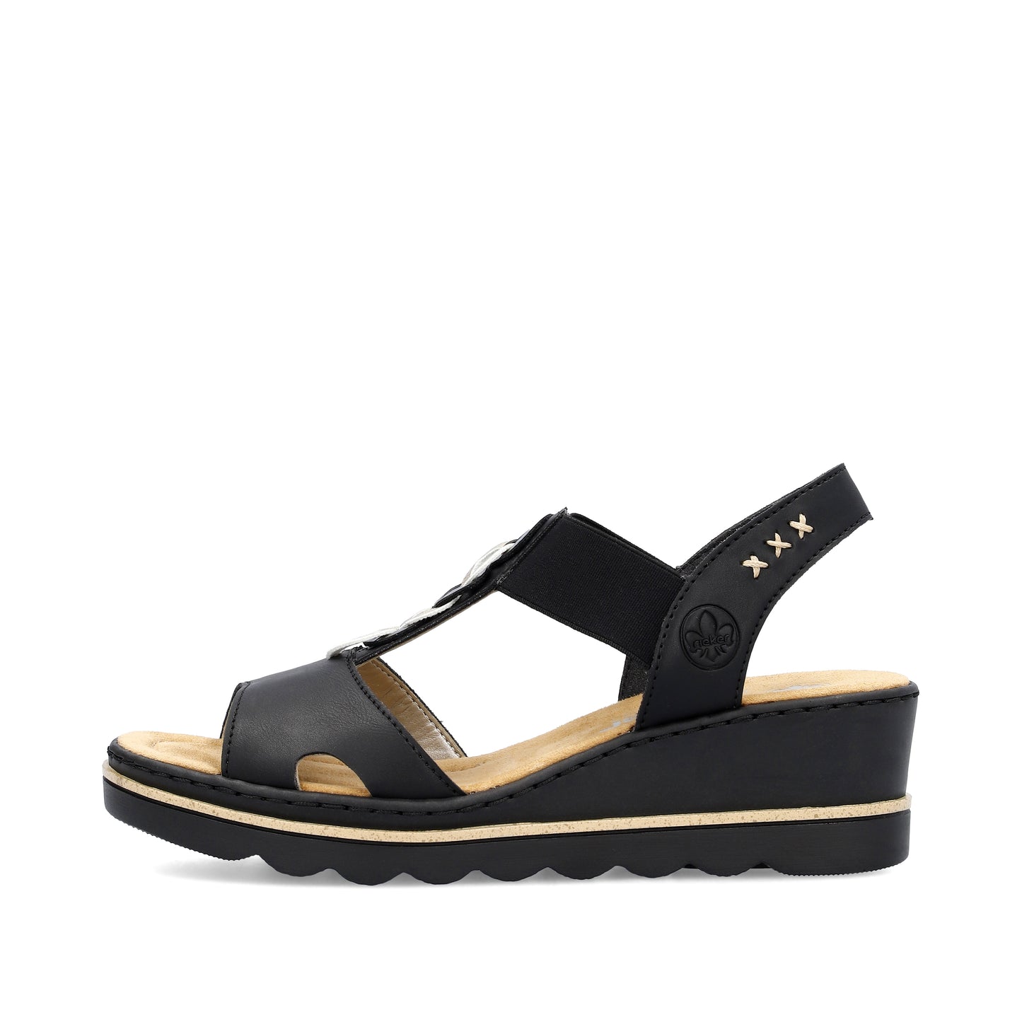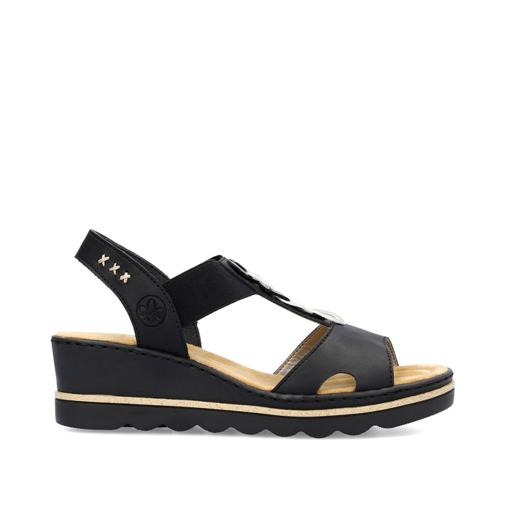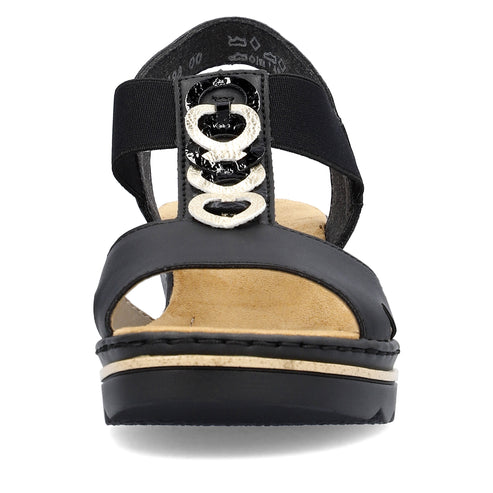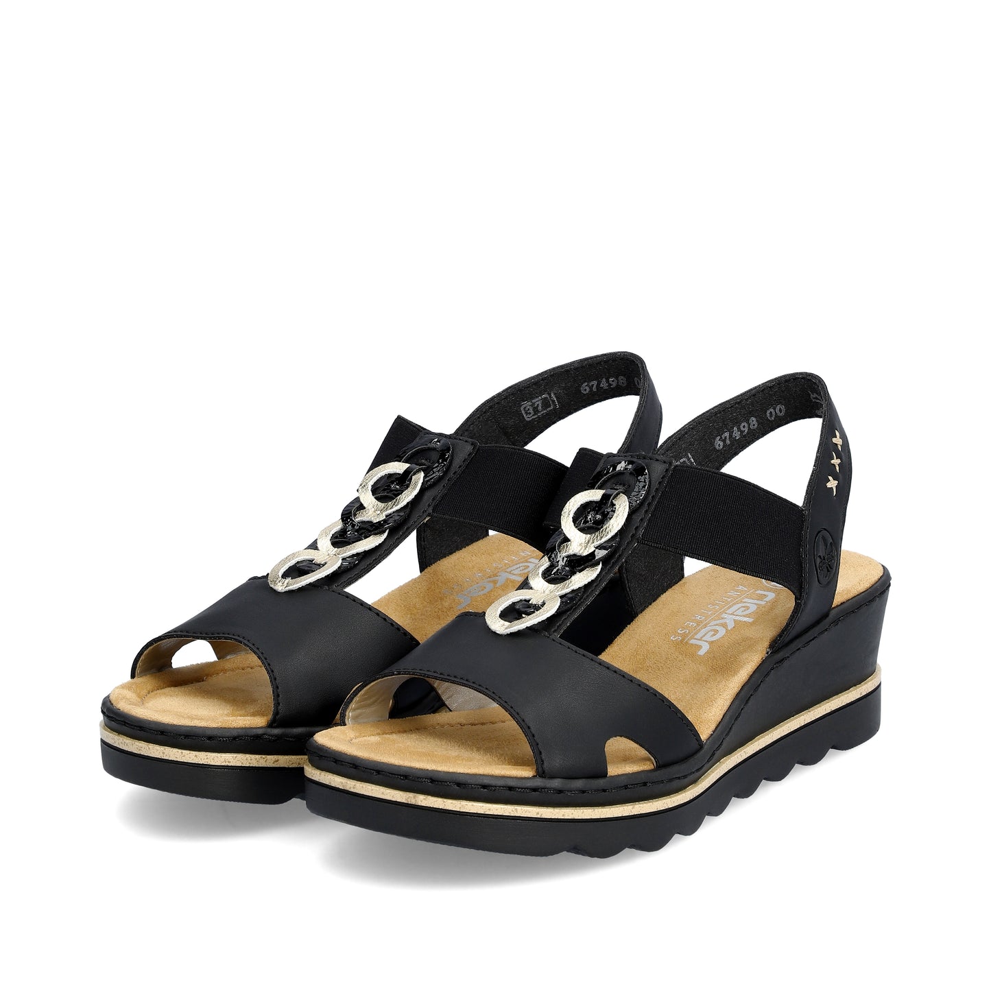 Black wedge sandal with toe strap, chain detail, and elastic back strap.
