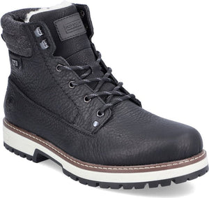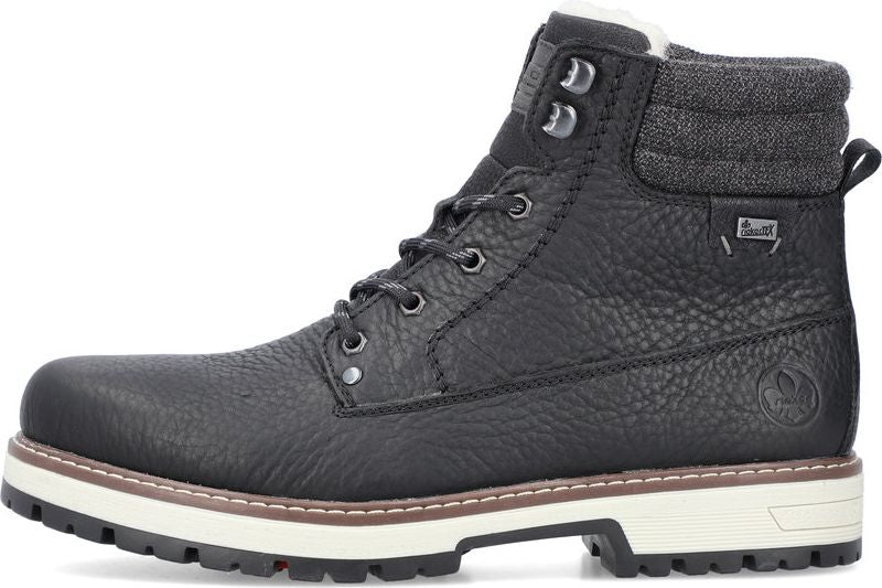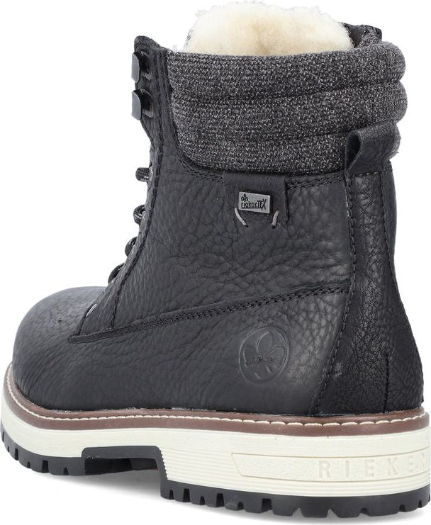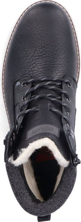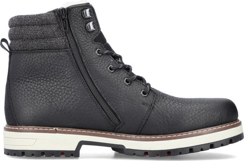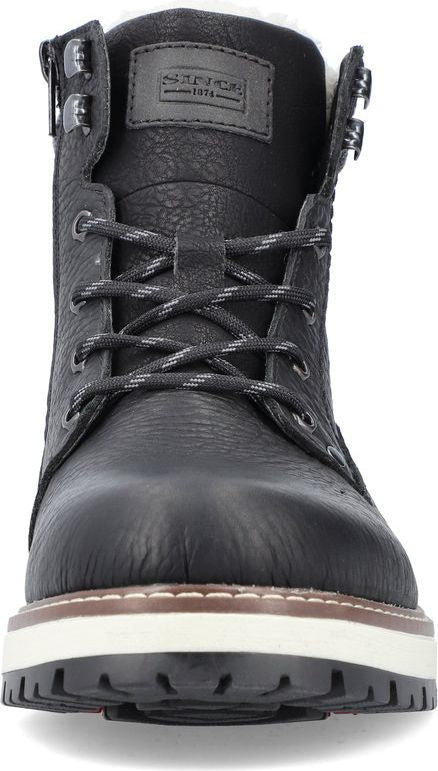 "Stay warm and stylish this winter with the Rieker Flip Grip Boot in black. This trendy men's ankle boot combines sleek leather with a cozy knit detail around the ankle, making it a perfect choice for any occasion. With Rieker's exceptional craftsmanship and attention to detail, you can trust that these boots are built to last.