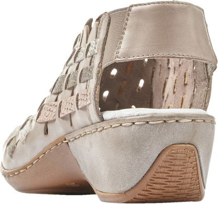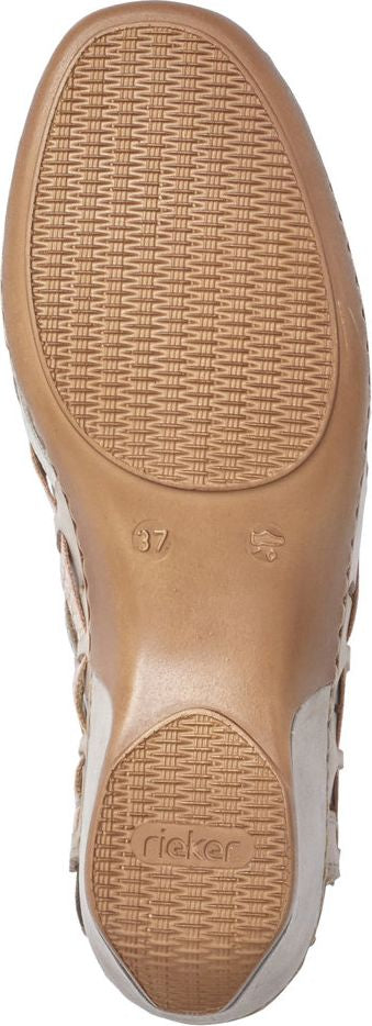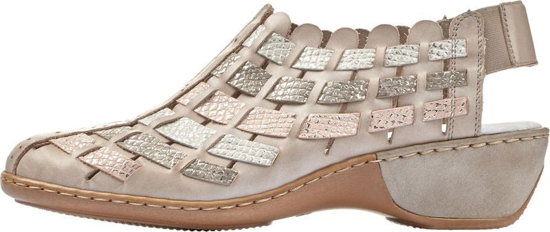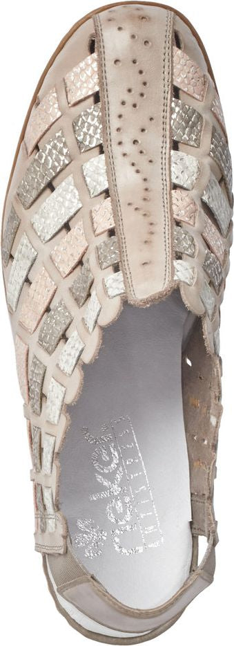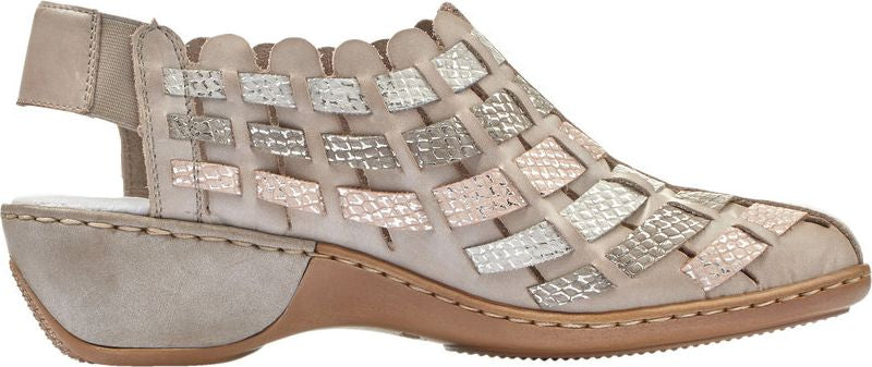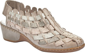 This low heeled sandal by RIEKER offers contrasting leather weaving and a deeply scalloped topline for a uniquely fashionable look.