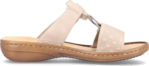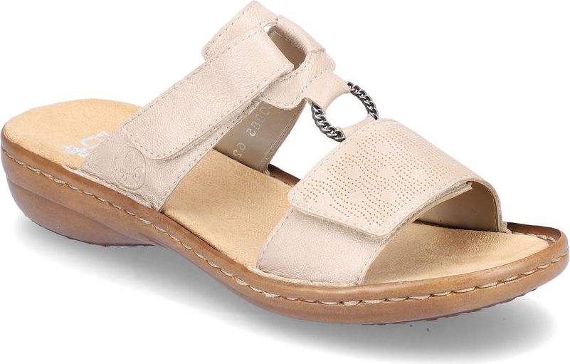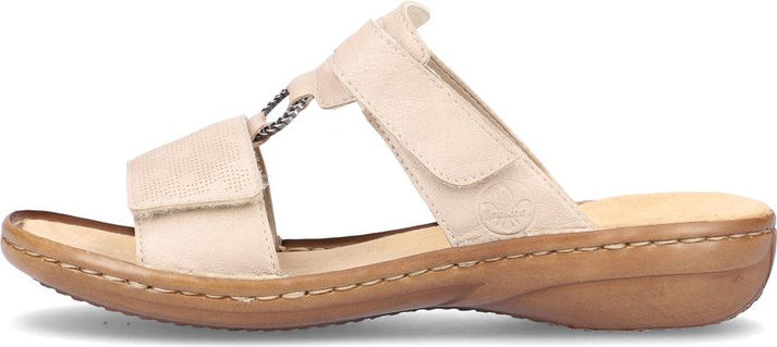 Beige sandal slide with adjustable velcro straps and a decorative ring detail.